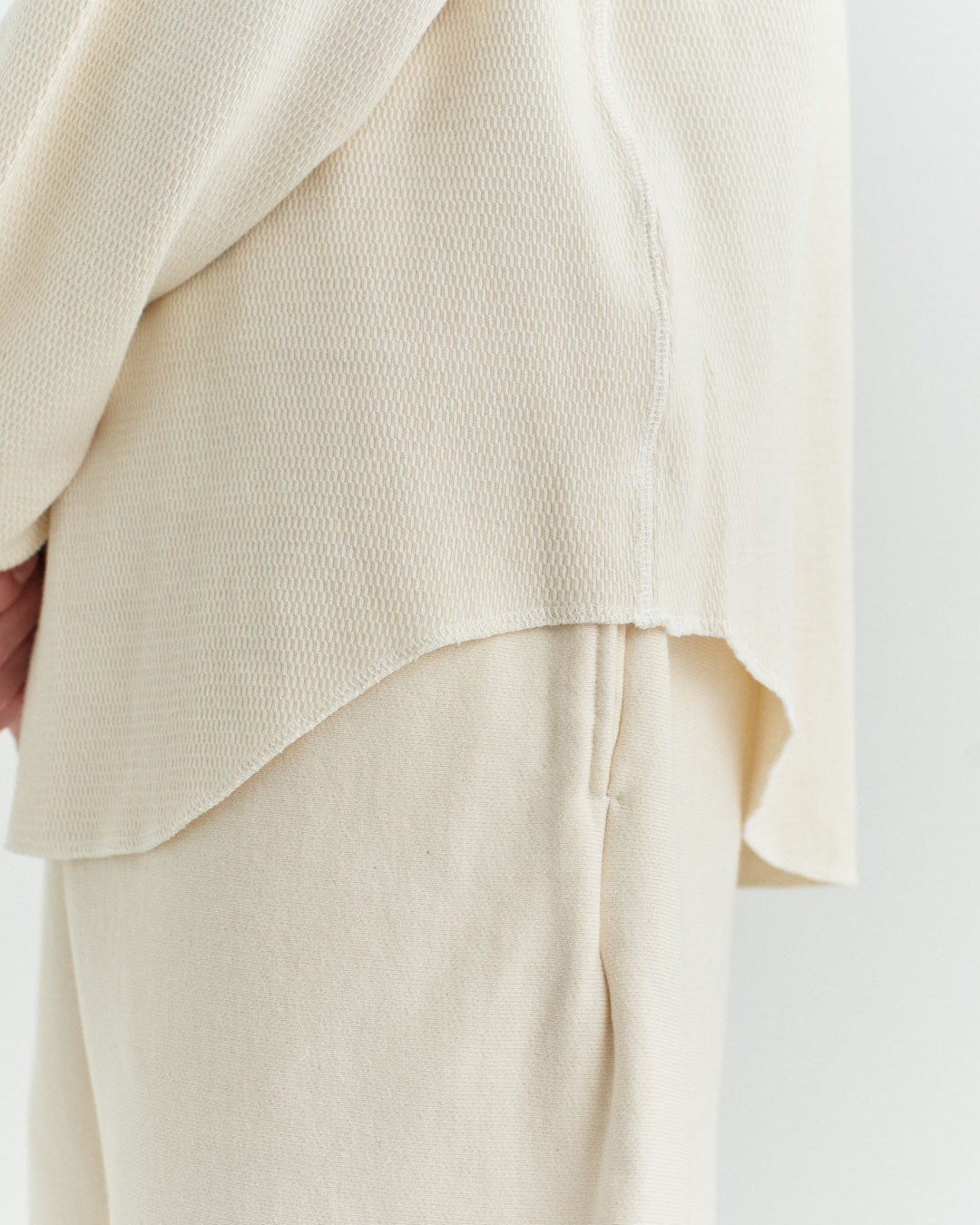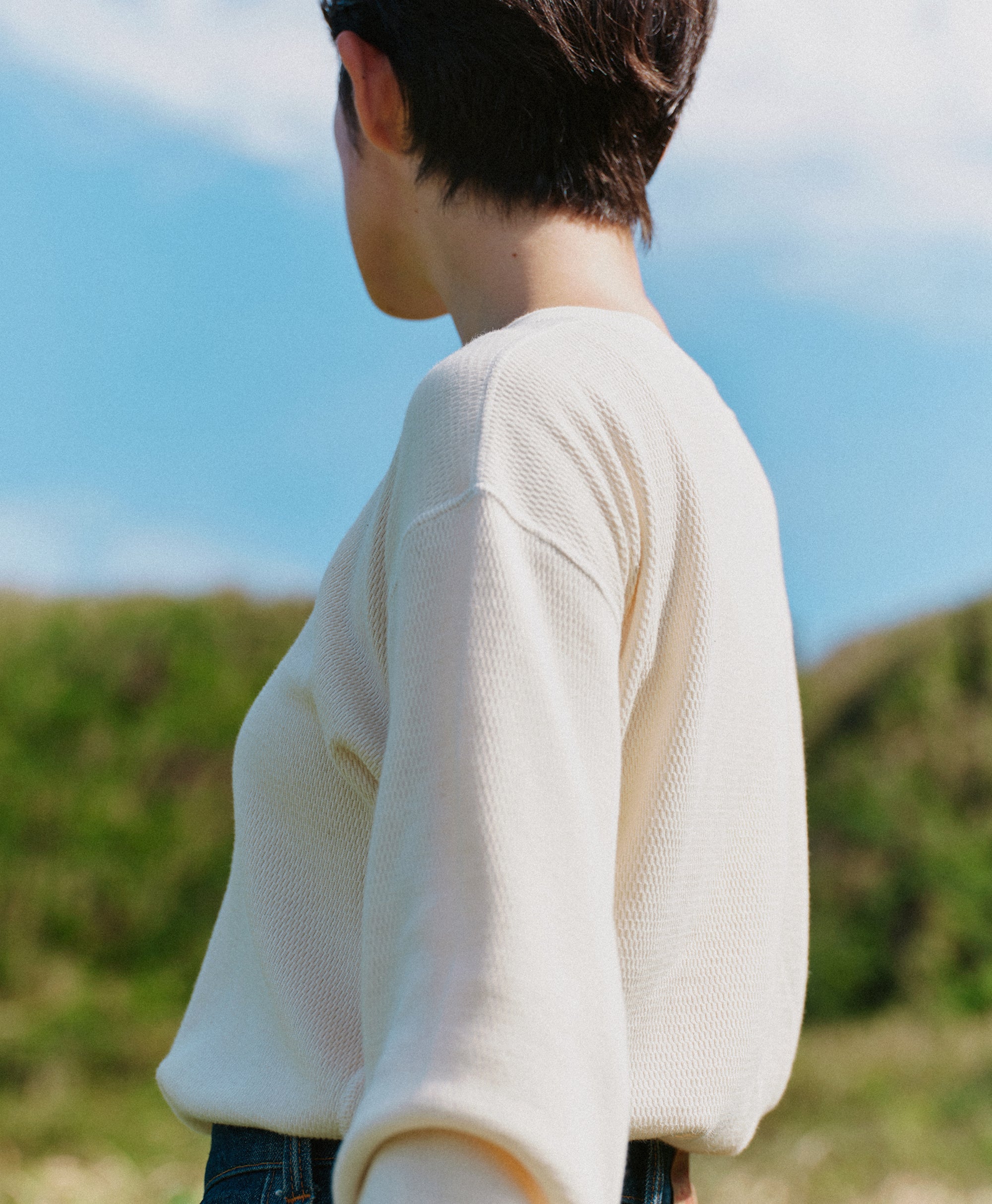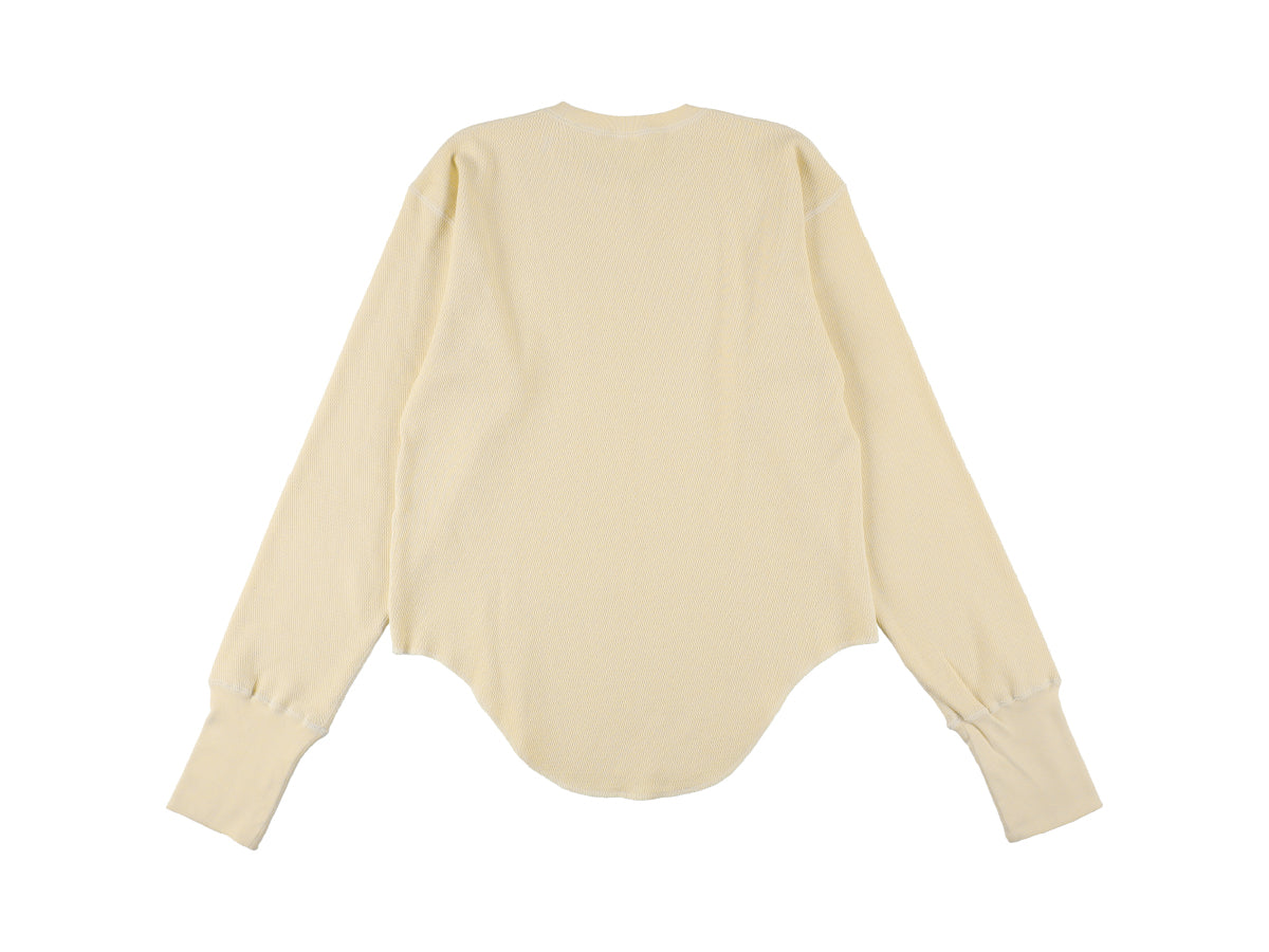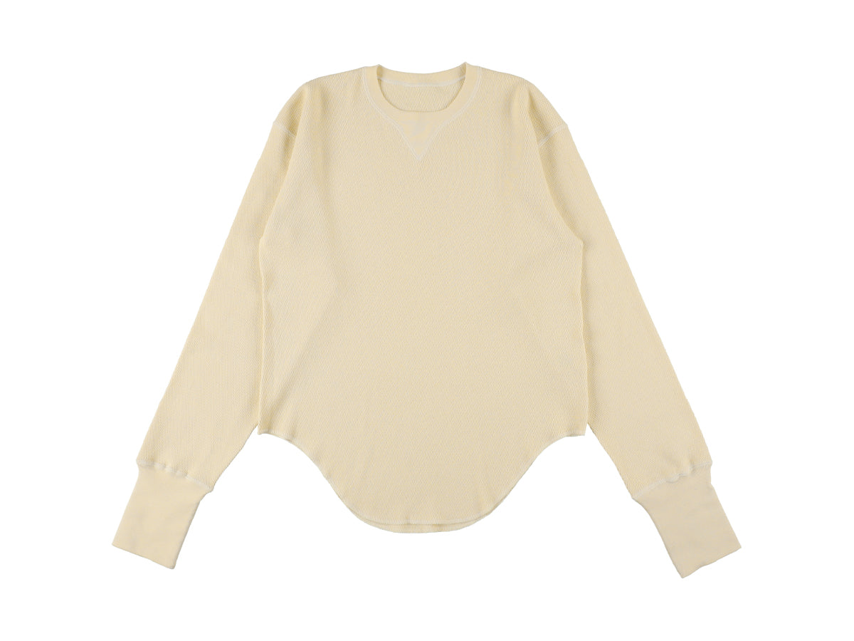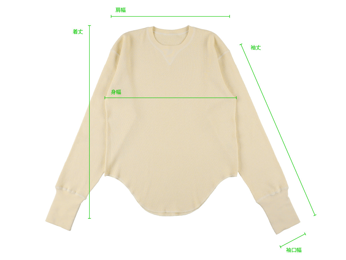 ビンテージのサーマルのシルエットをサンプリングしつつ、細かなディテールにSyncsらしいデザインを施しています。首回りは首に沿うような極力詰めたサイズ感でシャープに見せ、前中心の三角のリブハギを繋げてつけることによって着るときの頭のキツさを無くし、機能性をもったデザインに。 袖口のリブは長めにすることで見た目のバランスとともに袖をまくる際の安定感も追求した。 裾はボトムスにインする際の厚みが出ないように簡易的なロック始末。アウトしてもスッキリと腰回りのラインが美しく出るよう、裾はカーブを施しています。