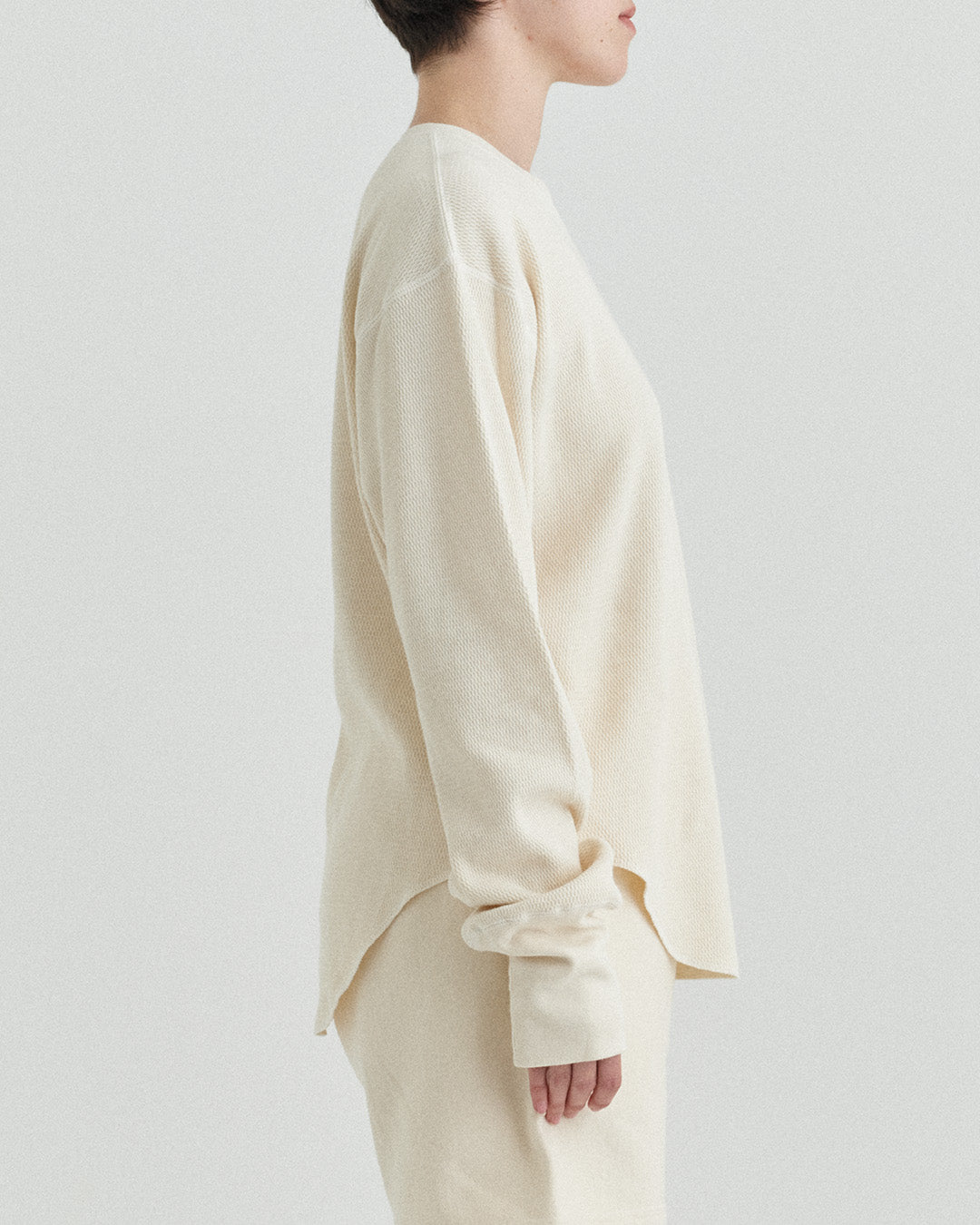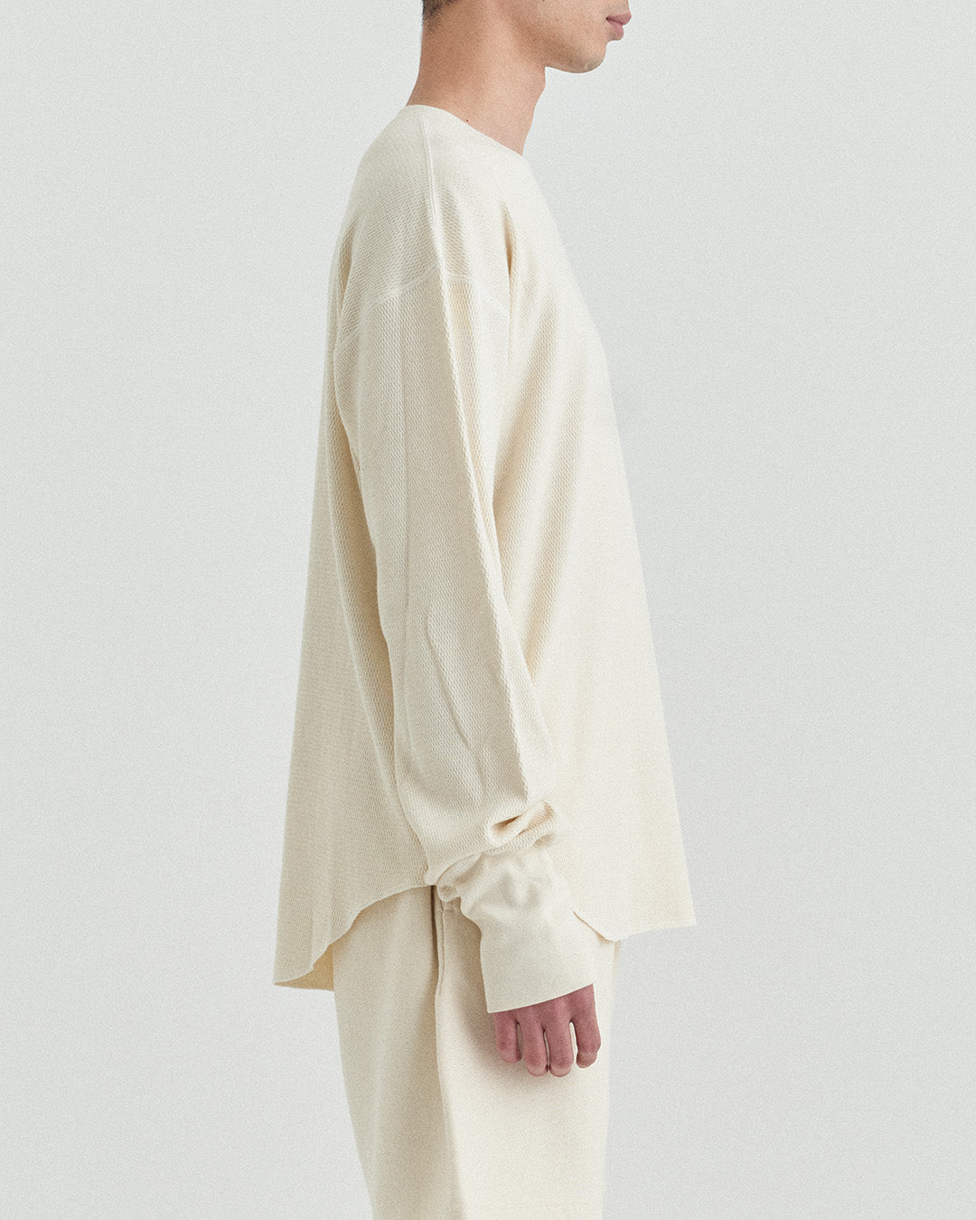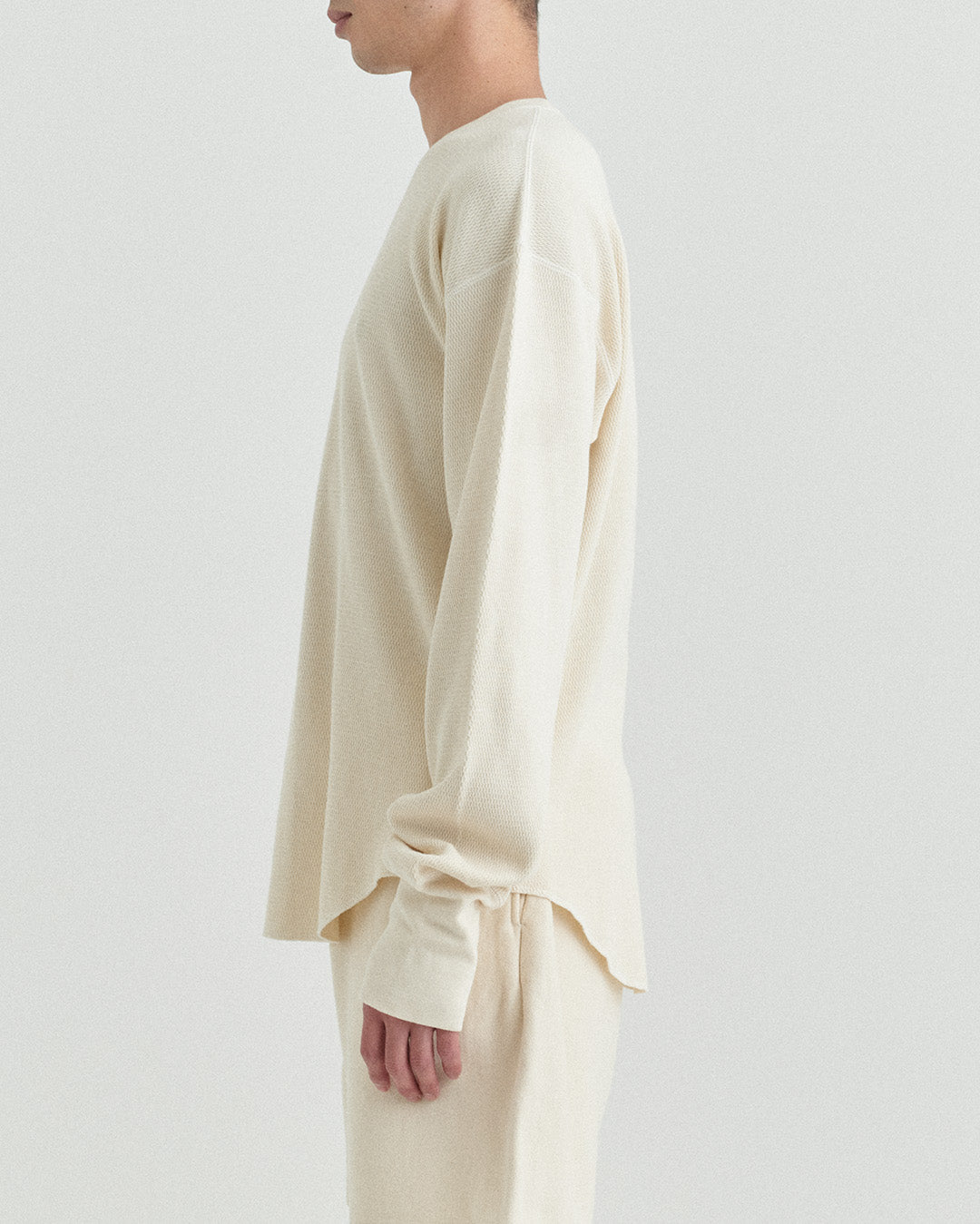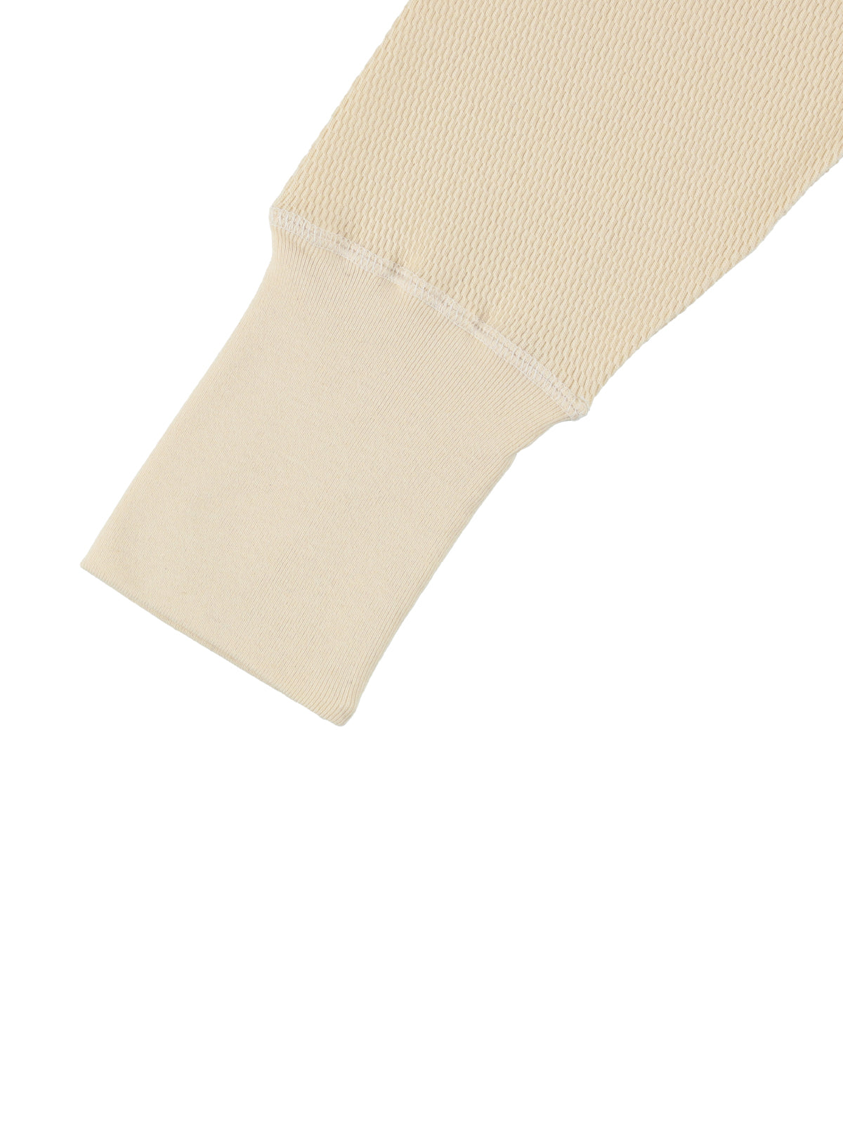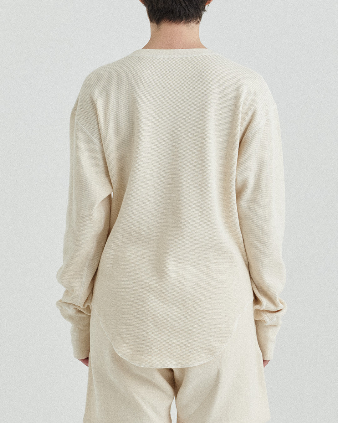 ビンテージのサーマルのシルエットをサンプリングしつつ、細かなディテールにSyncsらしいデザインを施しています。首回りは首に沿うような極力詰めたサイズ感でシャープに見せ、前中心の三角のリブハギを繋げてつけることによって着るときの頭のキツさを無くし、機能性をもったデザインに。 袖口のリブは長めにすることで見た目のバランスとともに袖をまくる際の安定感も追求した。 裾はボトムスにインする際の厚みが出ないように簡易的なロック始末。アウトしてもスッキリと腰回りのラインが美しく出るよう、裾はカーブを施しています。