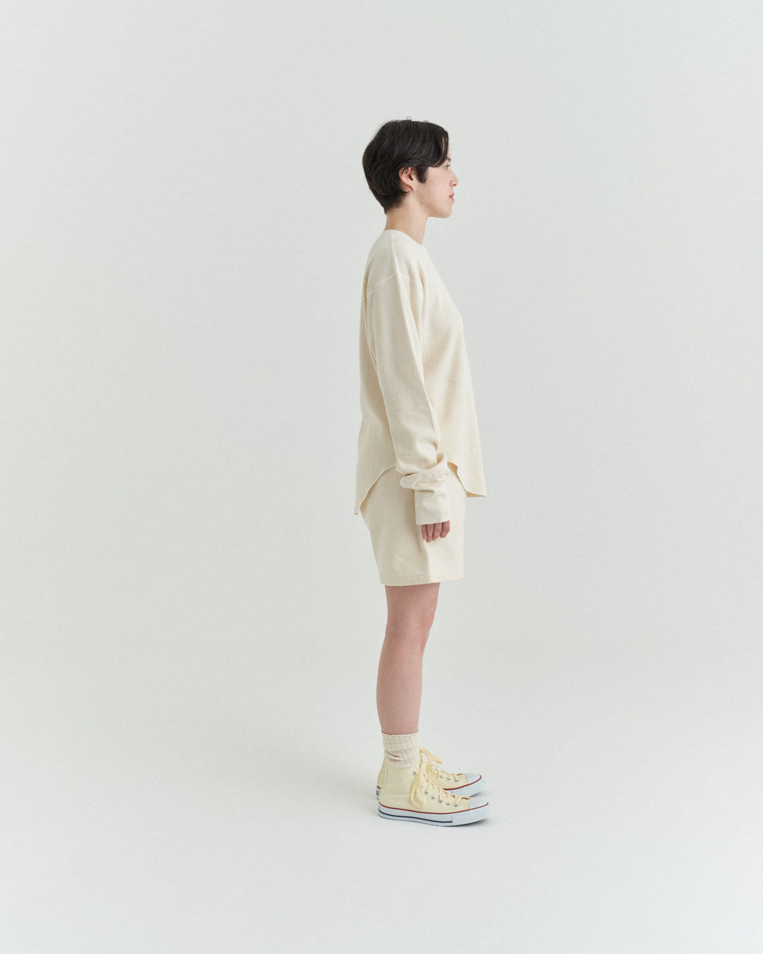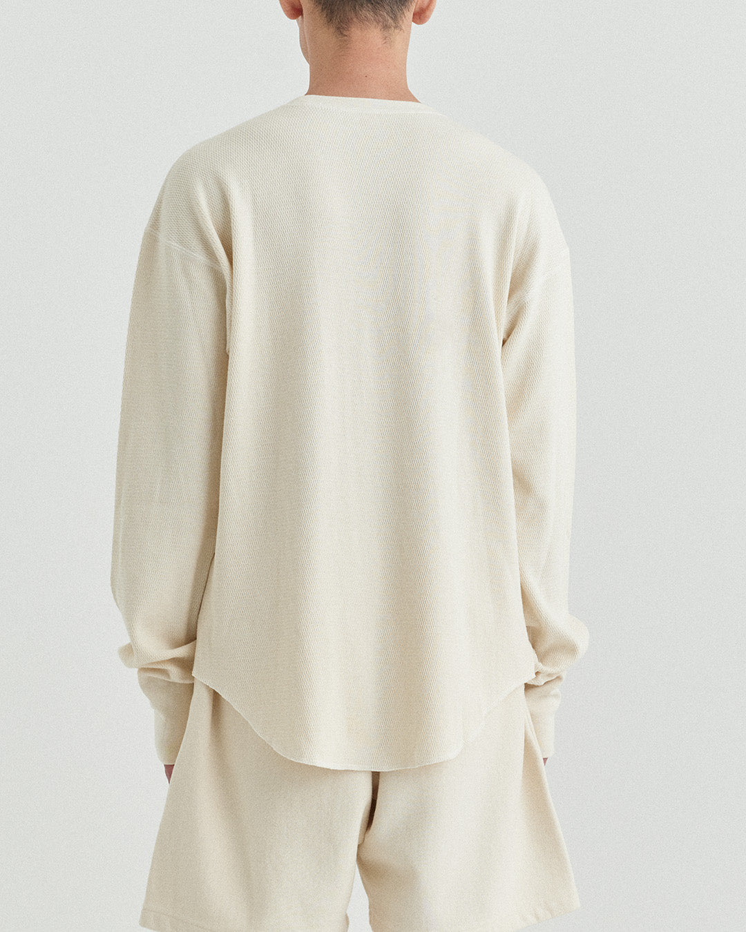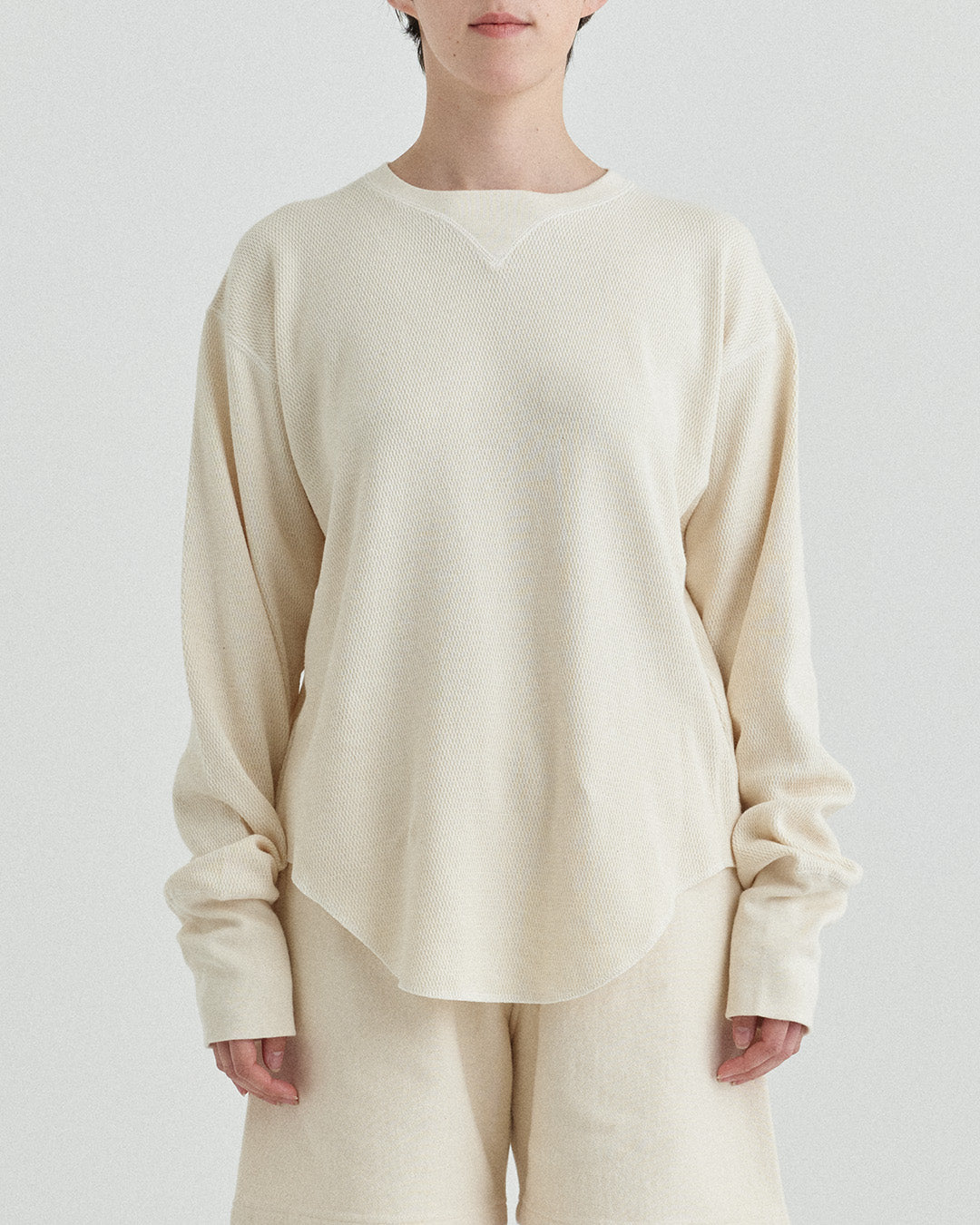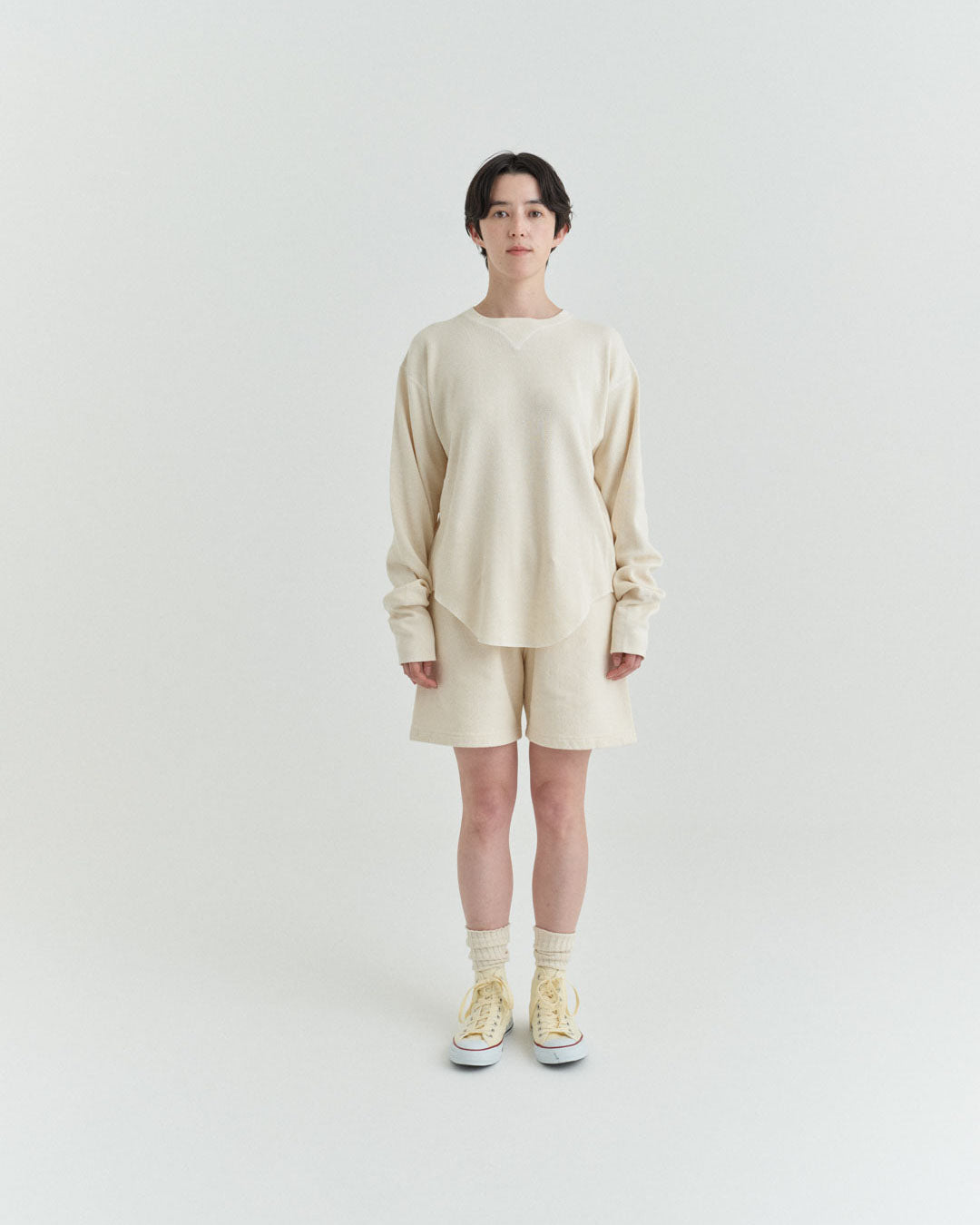 ビンテージのサーマルのシルエットをサンプリングしつつ、細かなディテールにSyncsらしいデザインを施しています。首回りは首に沿うような極力詰めたサイズ感でシャープに見せ、前中心の三角のリブハギを繋げてつけることによって着るときの頭のキツさを無くし、機能性をもったデザインに。 袖口のリブは長めにすることで見た目のバランスとともに袖をまくる際の安定感も追求した。 裾はボトムスにインする際の厚みが出ないように簡易的なロック始末。アウトしてもスッキリと腰回りのラインが美しく出るよう、裾はカーブを施しています。