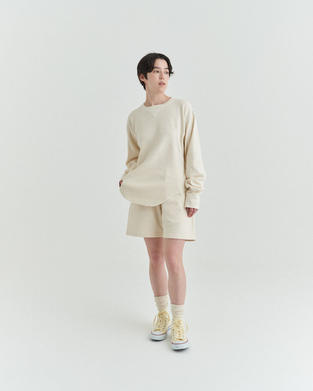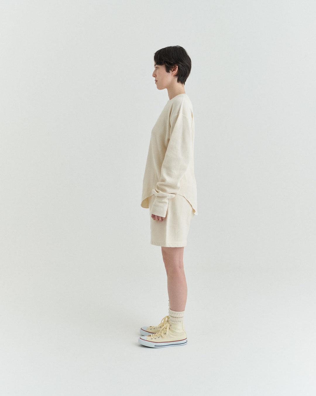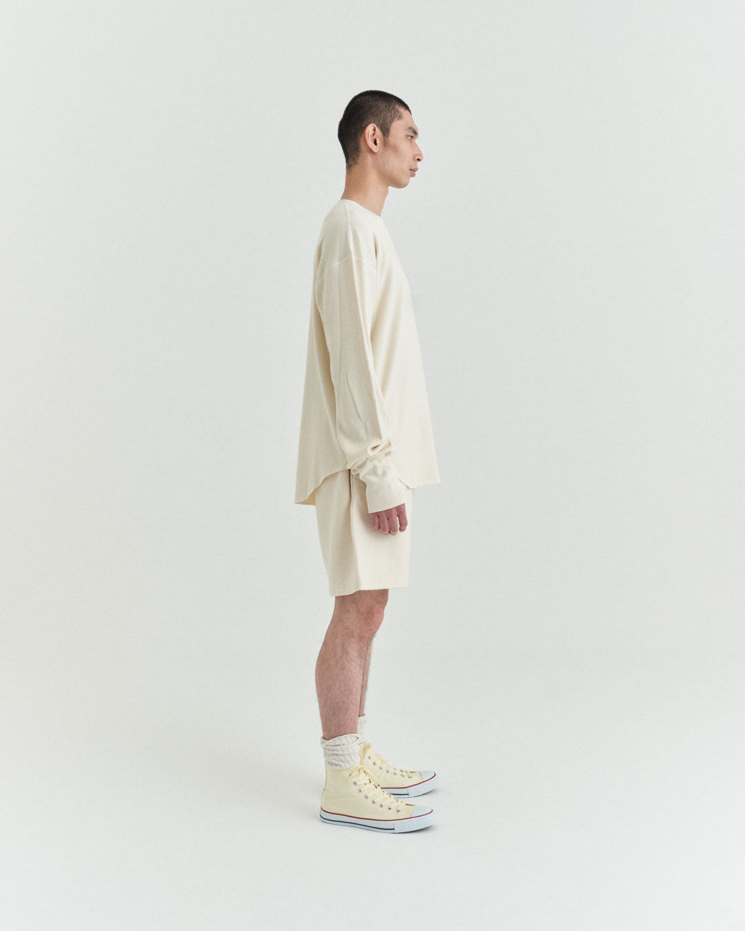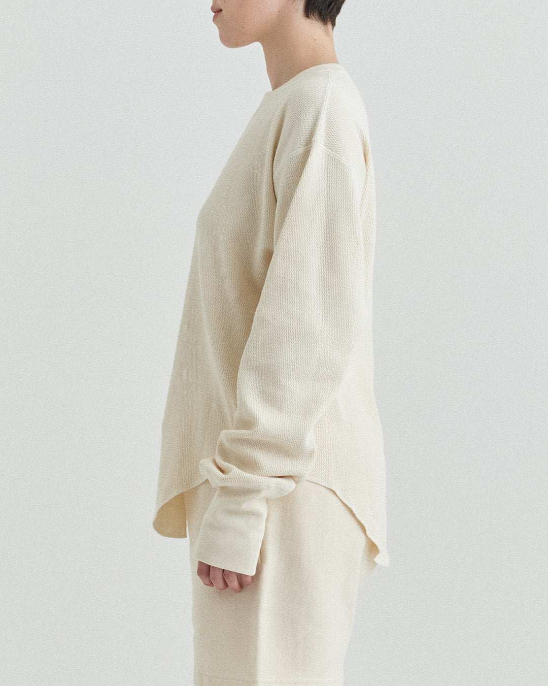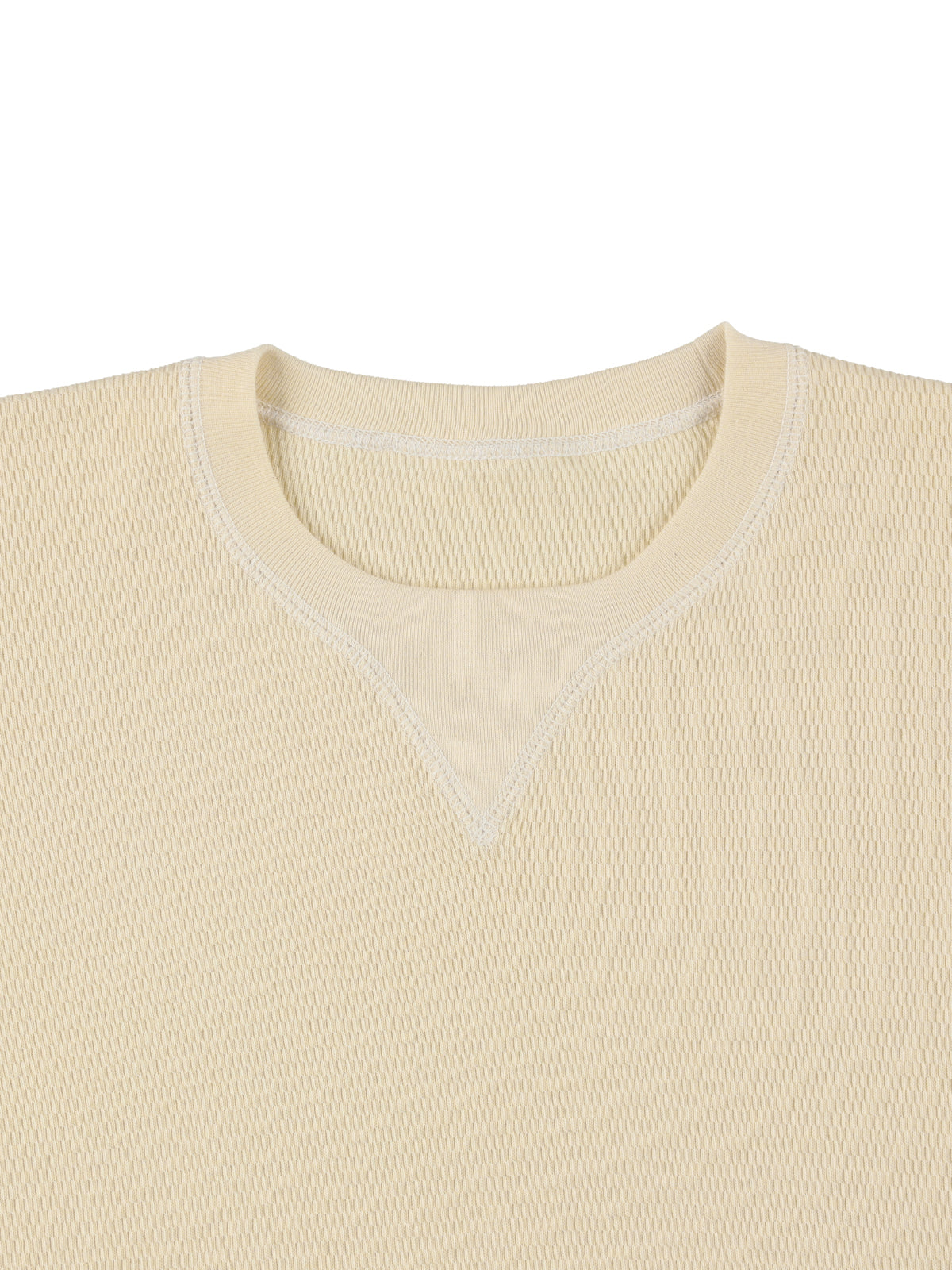 ビンテージのサーマルのシルエットをサンプリングしつつ、細かなディテールにSyncsらしいデザインを施しています。首回りは首に沿うような極力詰めたサイズ感でシャープに見せ、前中心の三角のリブハギを繋げてつけることによって着るときの頭のキツさを無くし、機能性をもったデザインに。 袖口のリブは長めにすることで見た目のバランスとともに袖をまくる際の安定感も追求した。 裾はボトムスにインする際の厚みが出ないように簡易的なロック始末。アウトしてもスッキリと腰回りのラインが美しく出るよう、裾はカーブを施しています。
