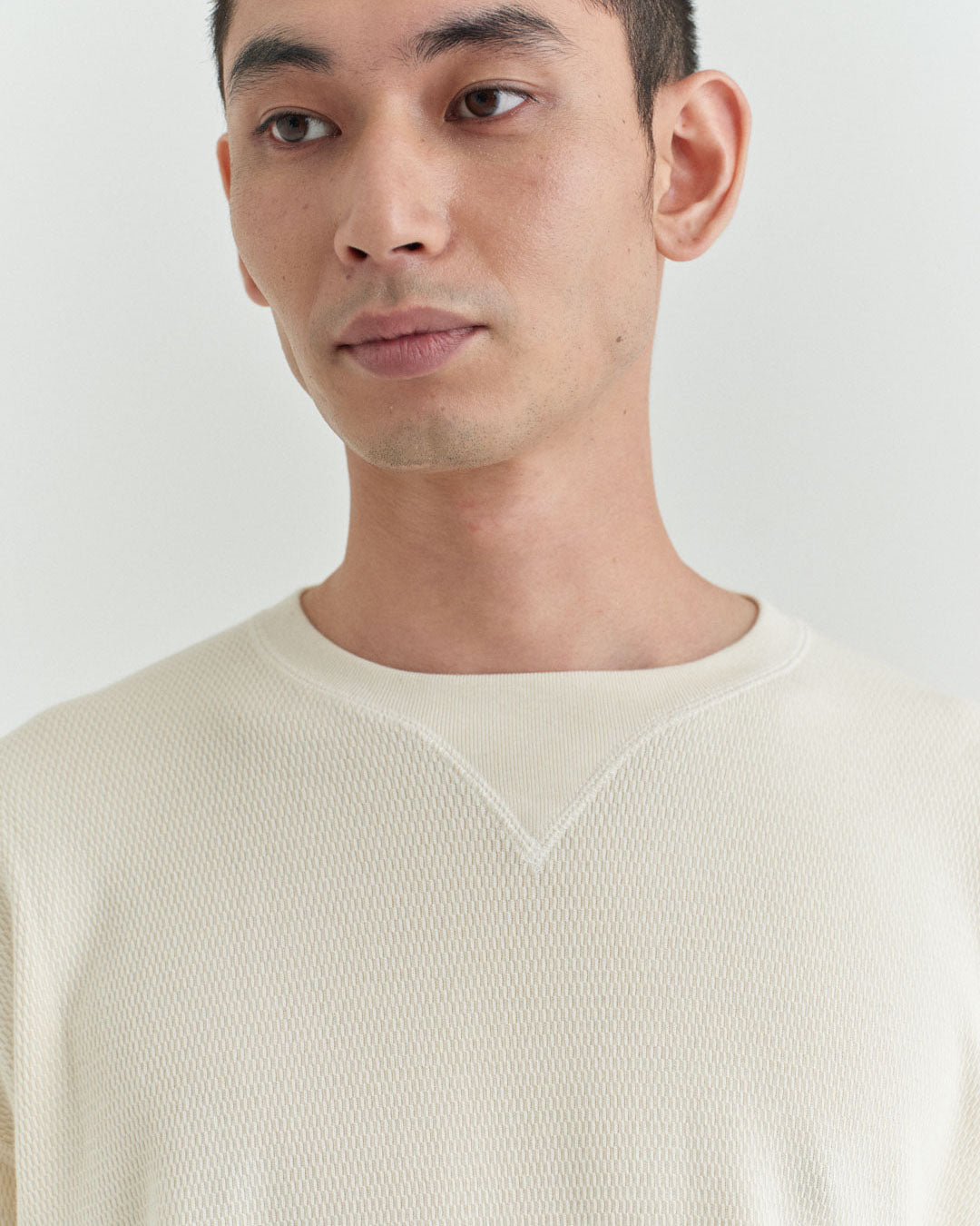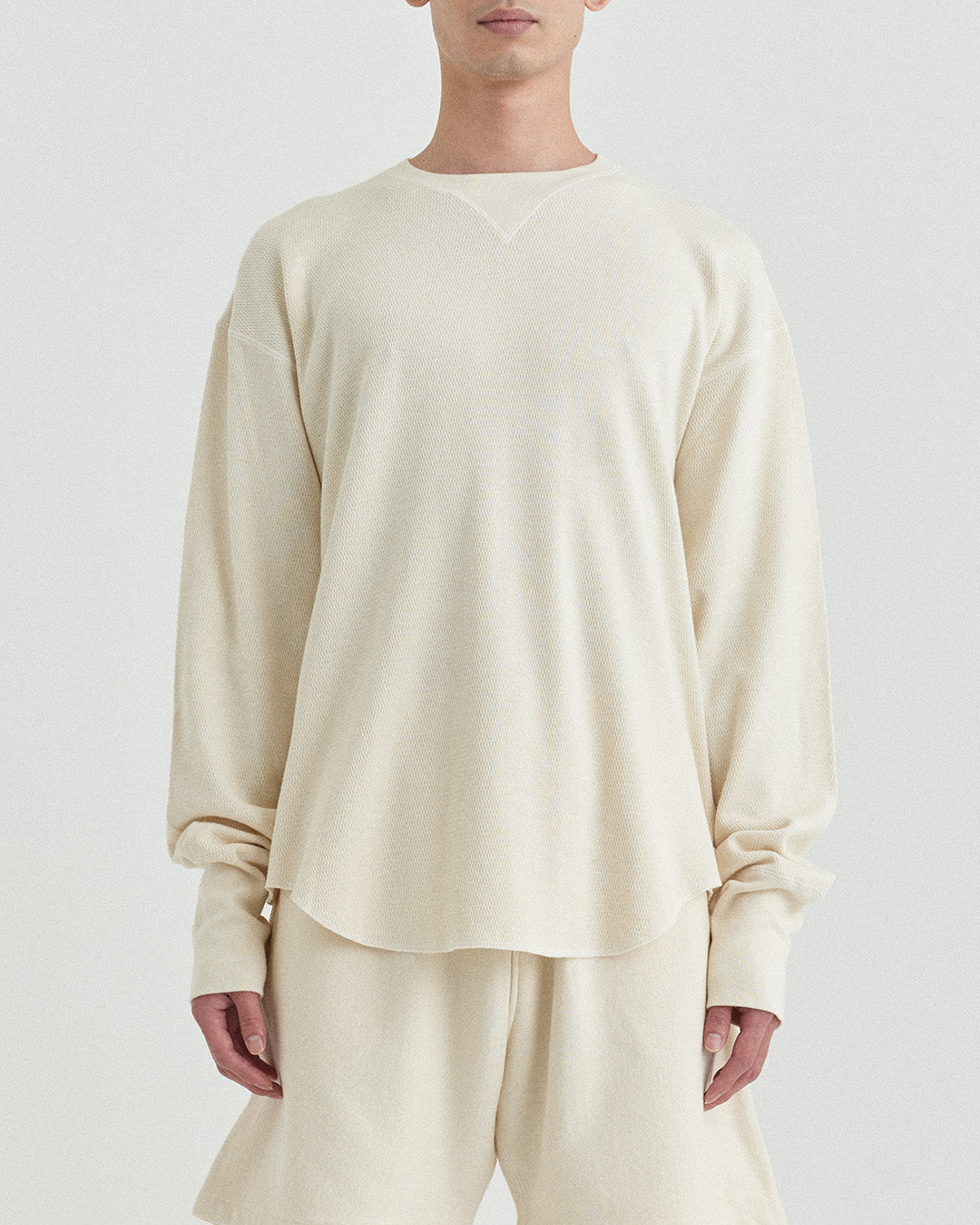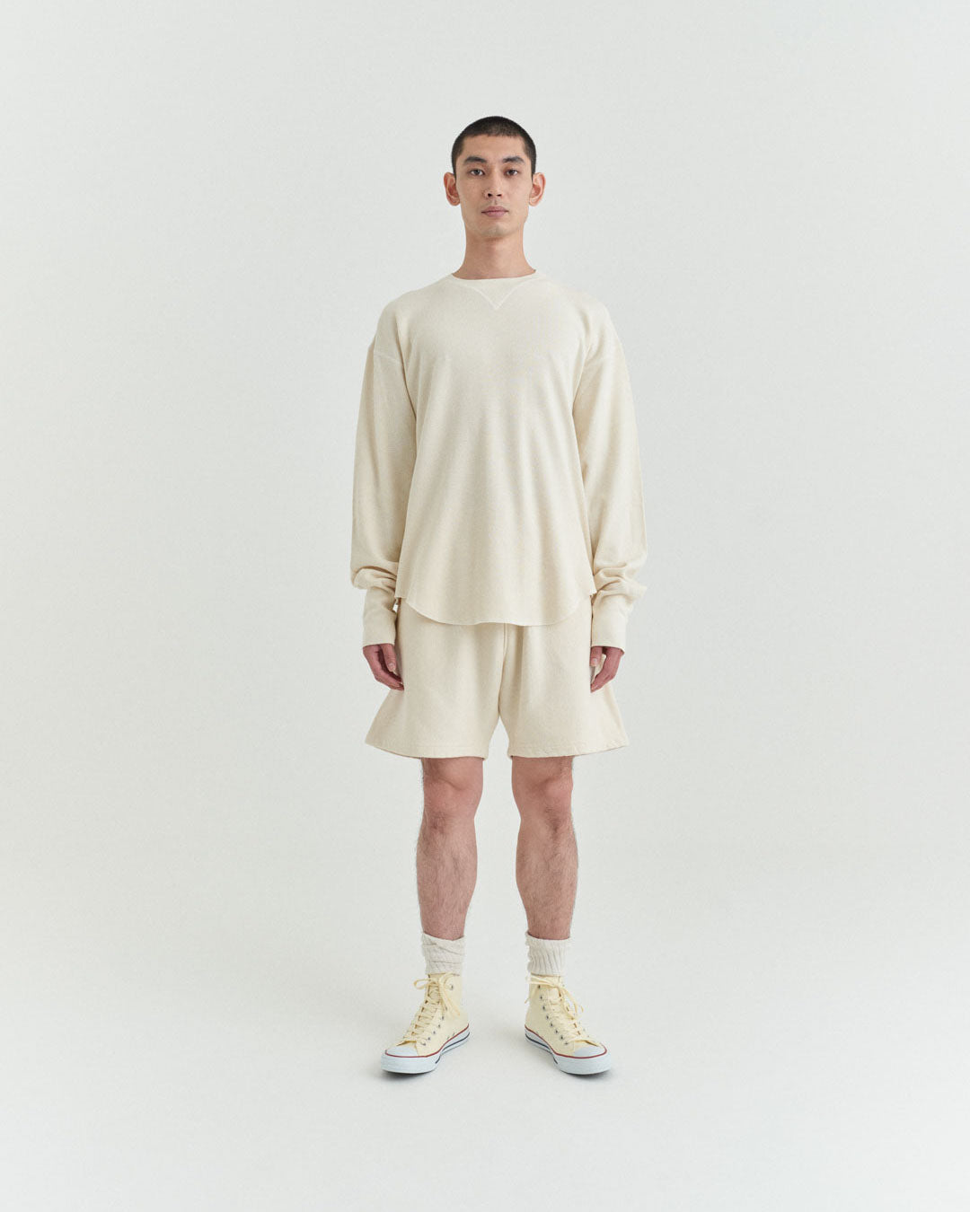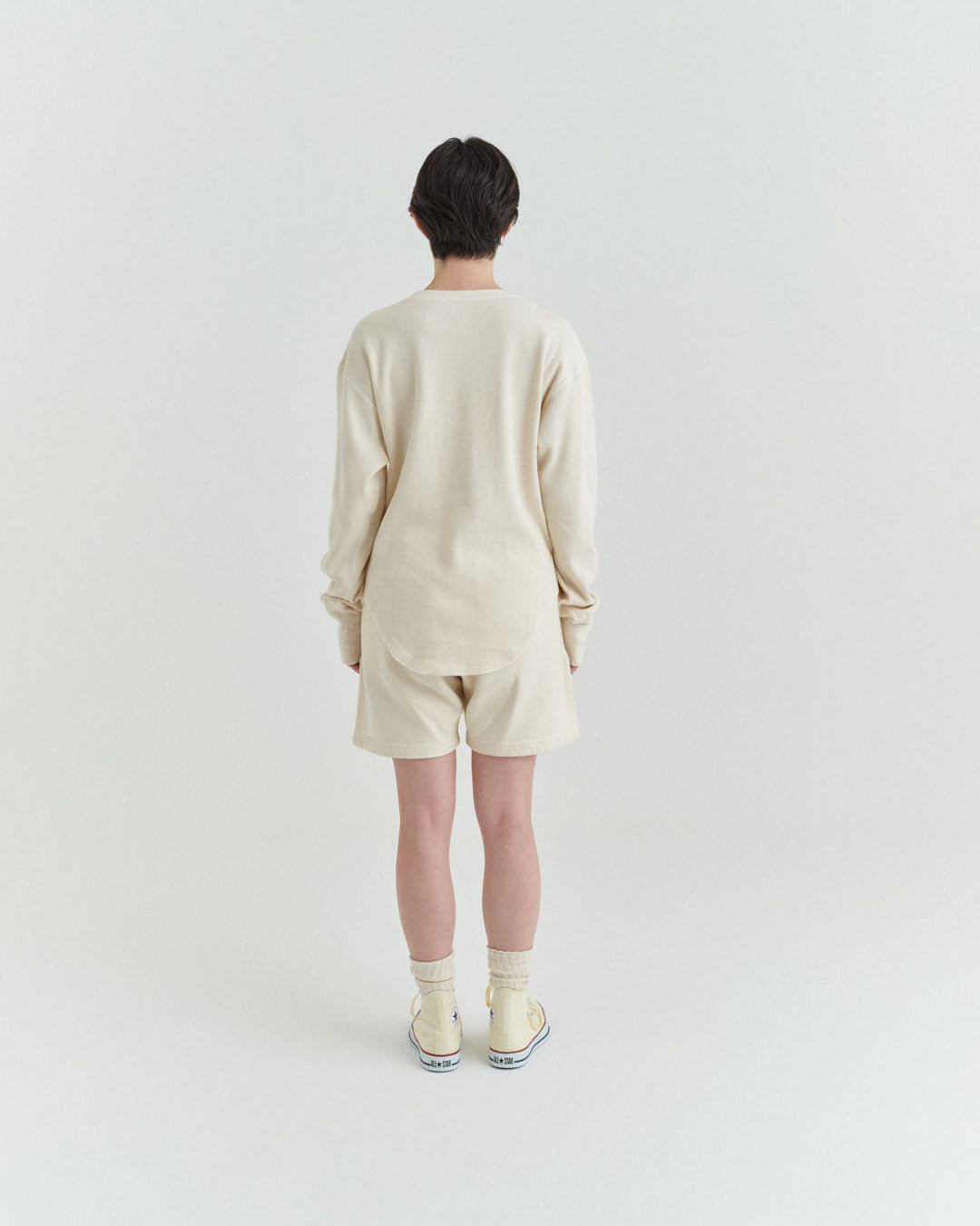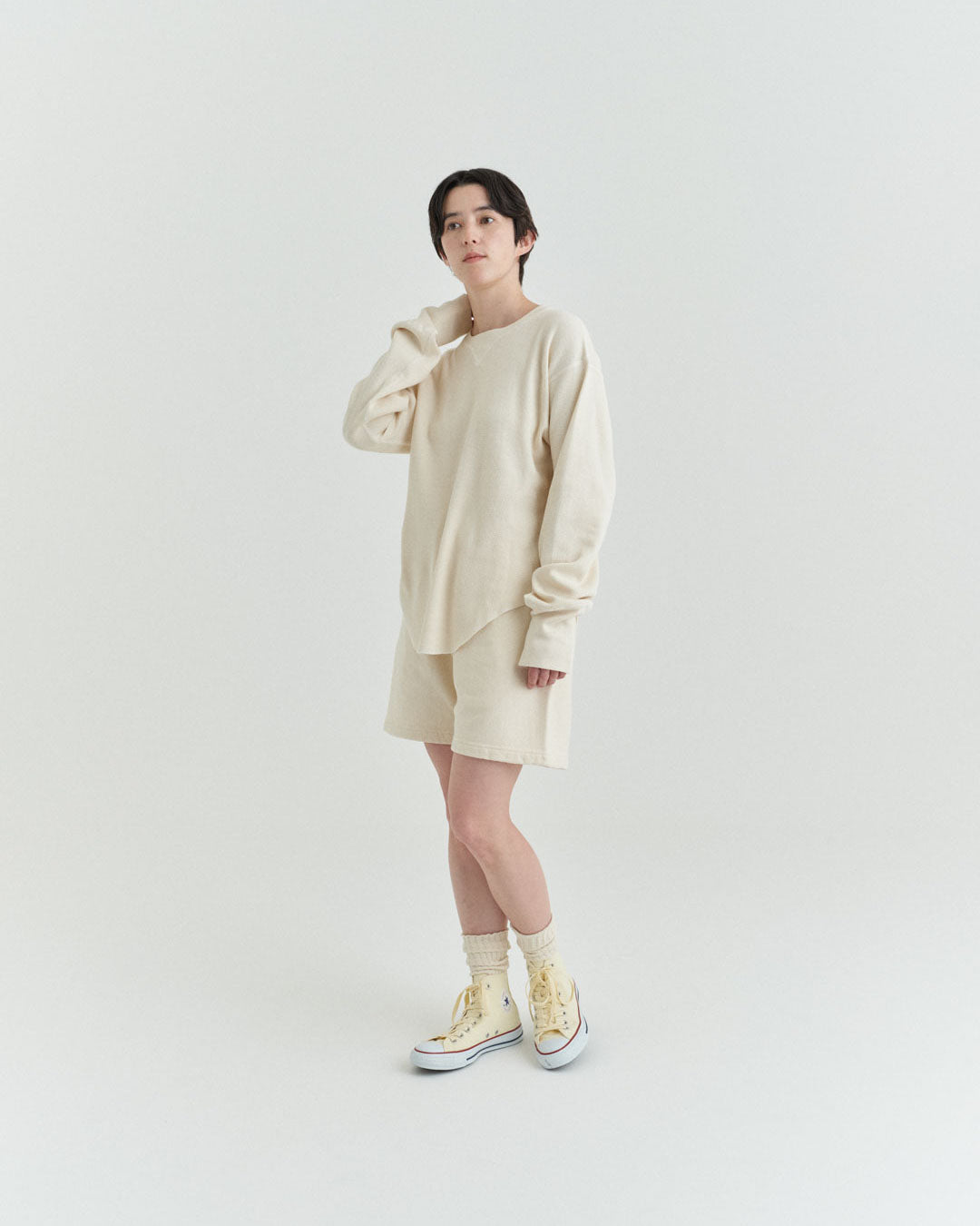 ビンテージのサーマルのシルエットをサンプリングしつつ、細かなディテールにSyncsらしいデザインを施しています。首回りは首に沿うような極力詰めたサイズ感でシャープに見せ、前中心の三角のリブハギを繋げてつけることによって着るときの頭のキツさを無くし、機能性をもったデザインに。 袖口のリブは長めにすることで見た目のバランスとともに袖をまくる際の安定感も追求した。 裾はボトムスにインする際の厚みが出ないように簡易的なロック始末。アウトしてもスッキリと腰回りのラインが美しく出るよう、裾はカーブを施しています。