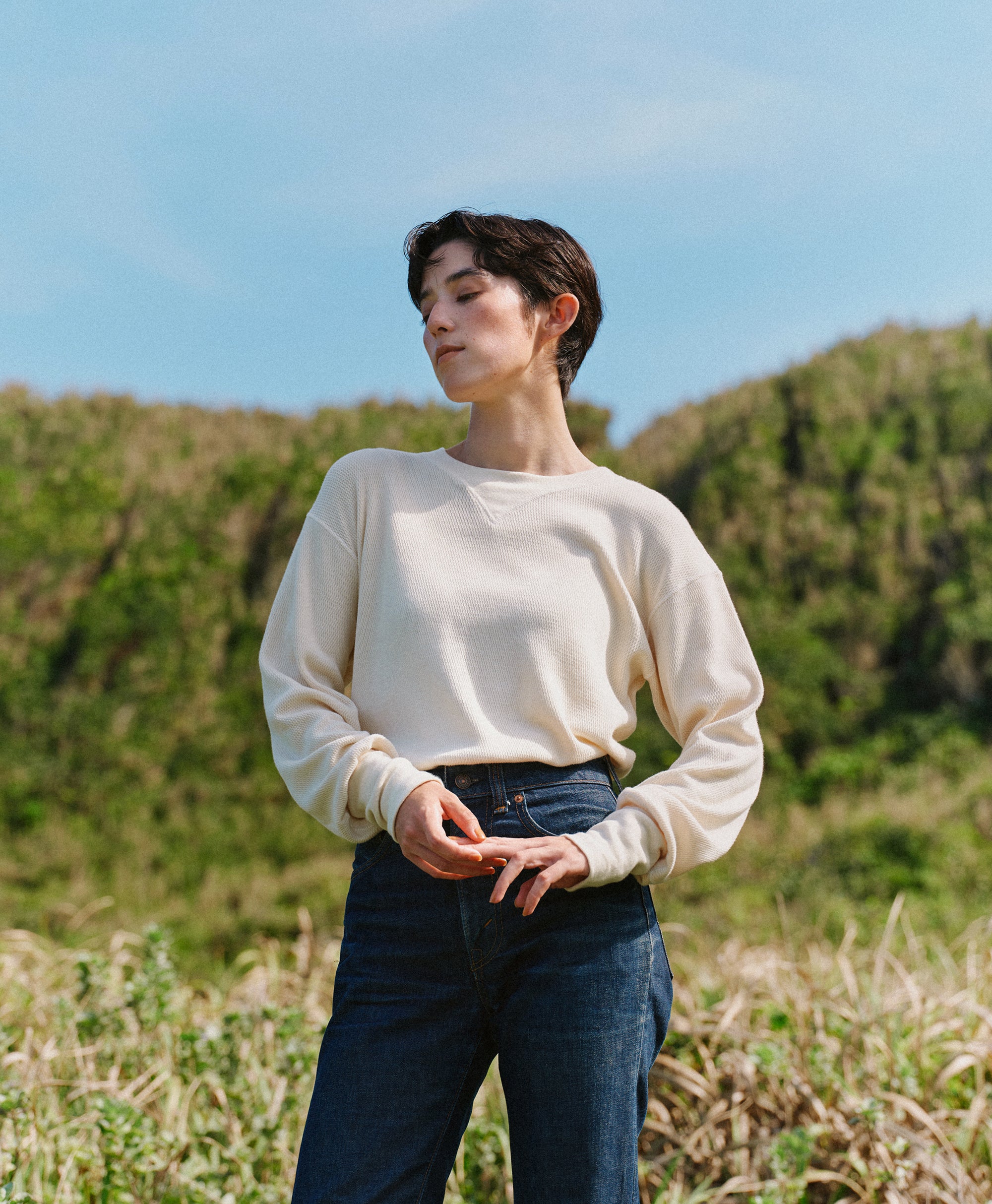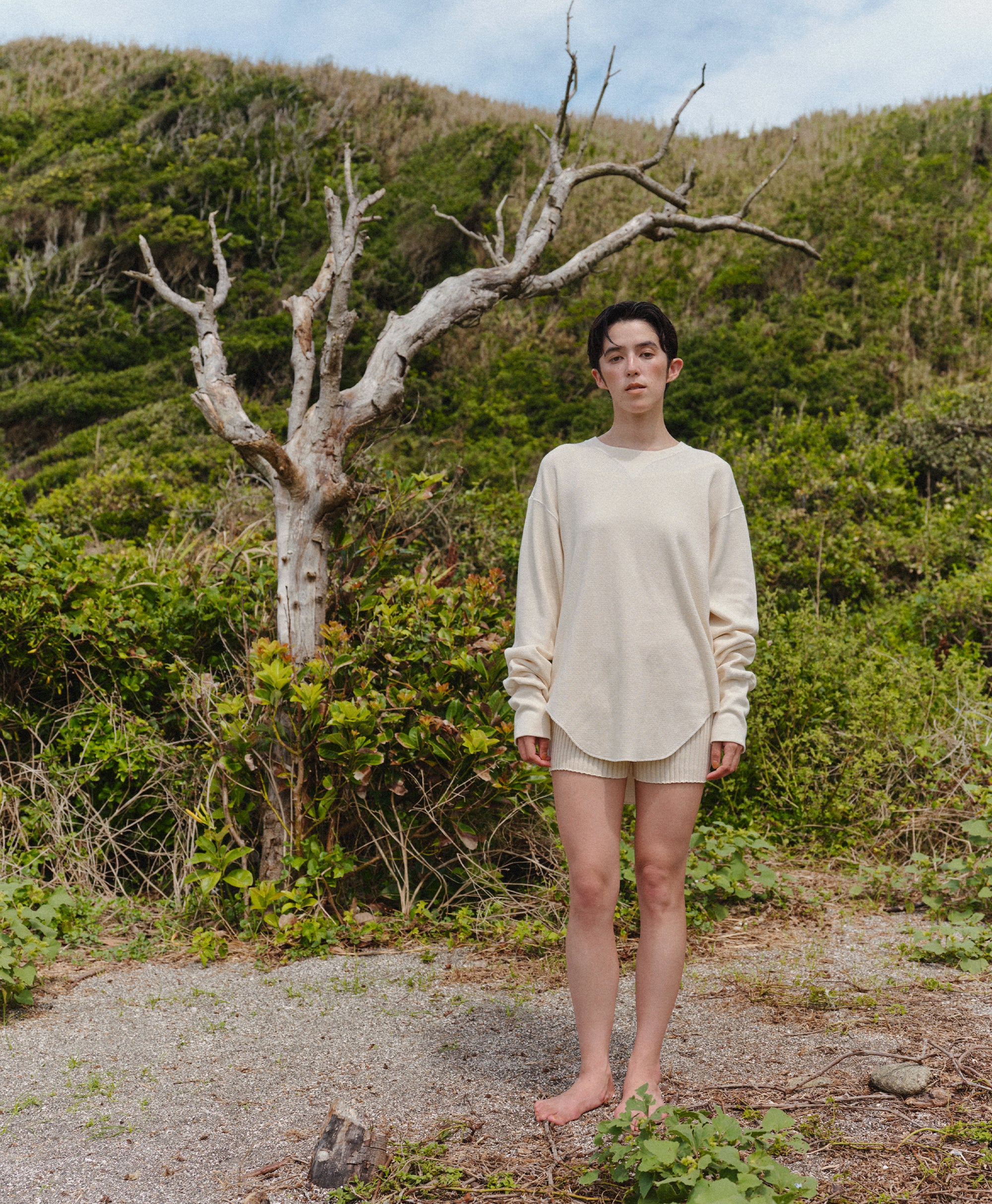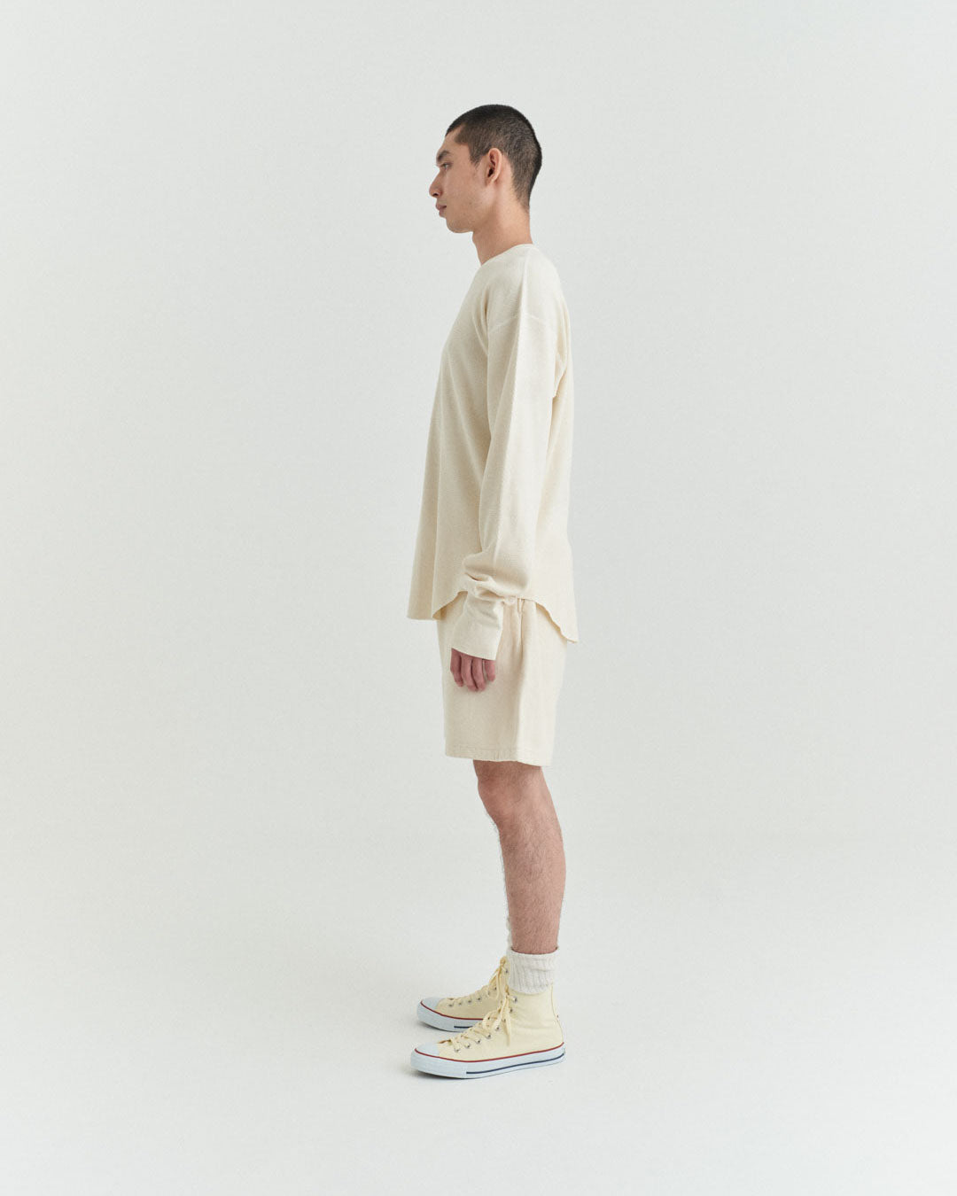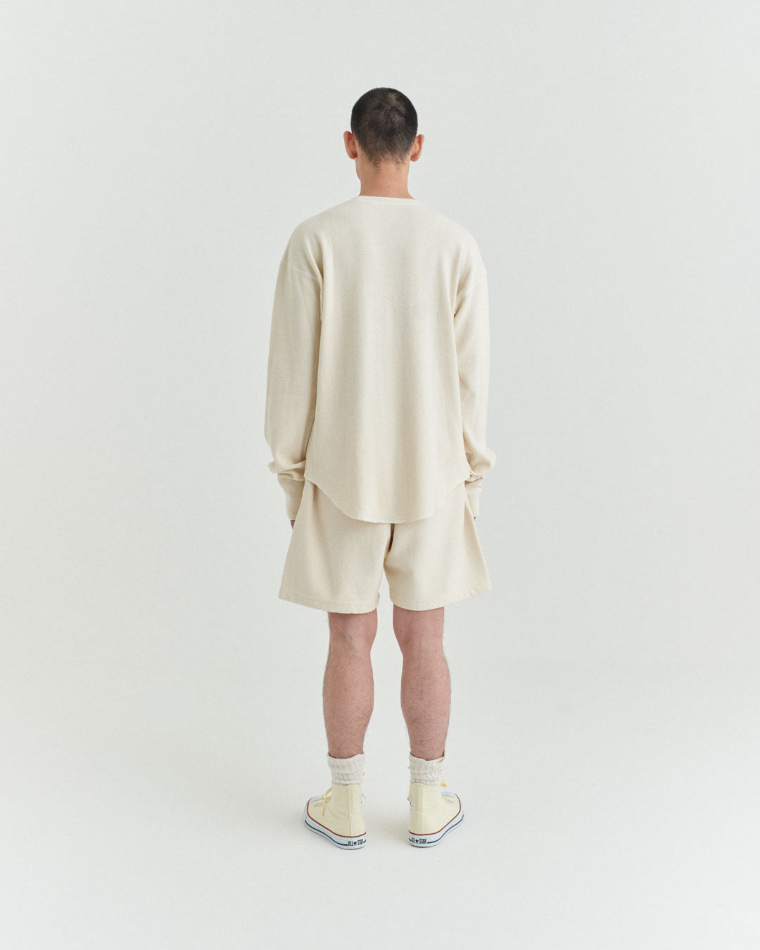 ビンテージのサーマルのシルエットをサンプリングしつつ、細かなディテールにSyncsらしいデザインを施しています。首回りは首に沿うような極力詰めたサイズ感でシャープに見せ、前中心の三角のリブハギを繋げてつけることによって着るときの頭のキツさを無くし、機能性をもったデザインに。 袖口のリブは長めにすることで見た目のバランスとともに袖をまくる際の安定感も追求した。 裾はボトムスにインする際の厚みが出ないように簡易的なロック始末。アウトしてもスッキリと腰回りのラインが美しく出るよう、裾はカーブを施しています。
