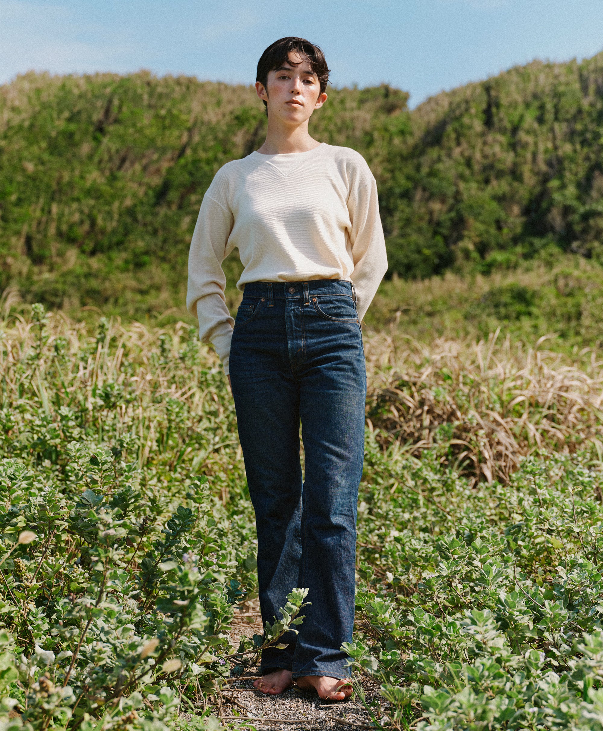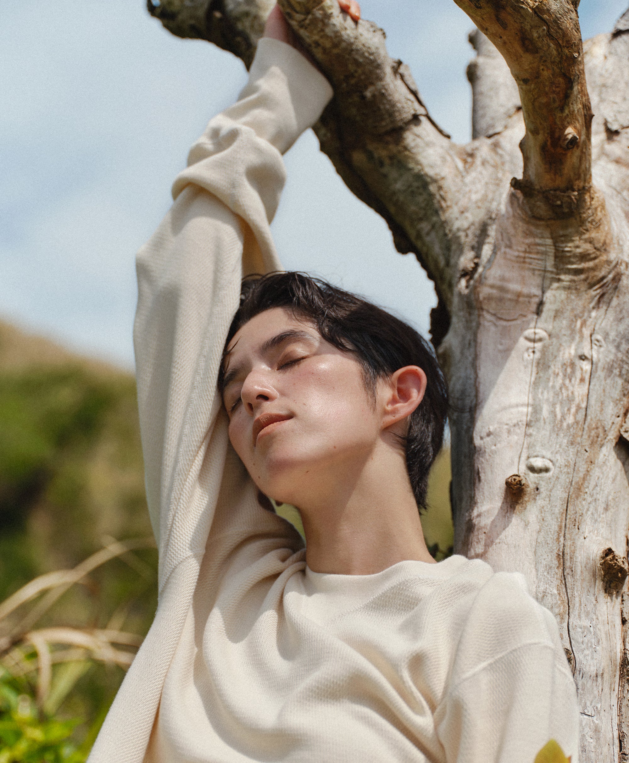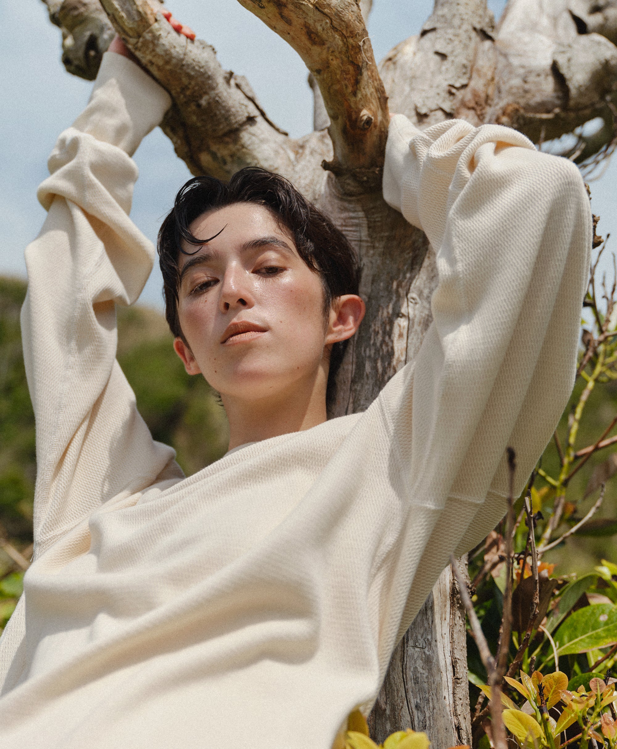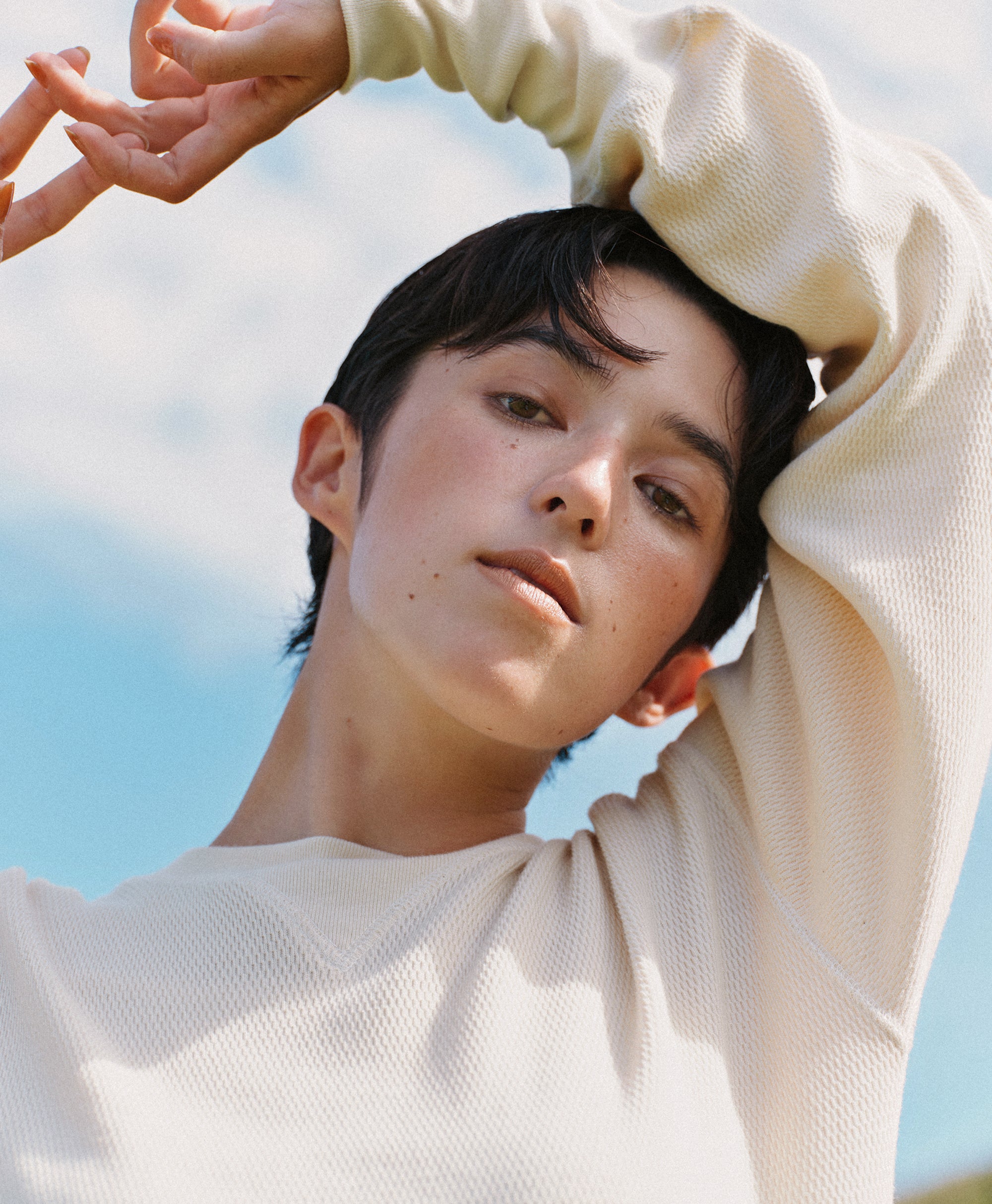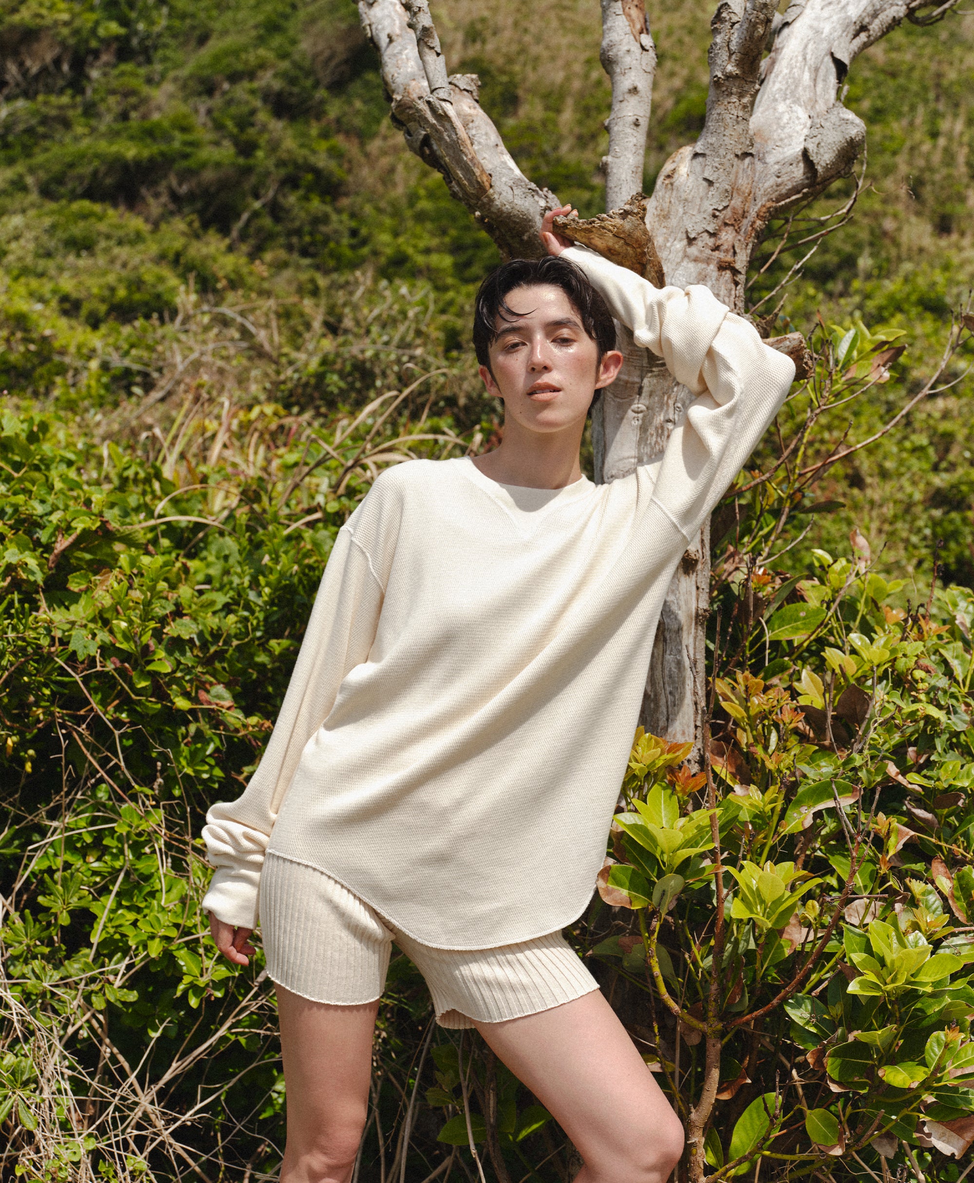 ビンテージのサーマルのシルエットをサンプリングしつつ、細かなディテールにSyncsらしいデザインを施しています。首回りは首に沿うような極力詰めたサイズ感でシャープに見せ、前中心の三角のリブハギを繋げてつけることによって着るときの頭のキツさを無くし、機能性をもったデザインに。 袖口のリブは長めにすることで見た目のバランスとともに袖をまくる際の安定感も追求した。 裾はボトムスにインする際の厚みが出ないように簡易的なロック始末。アウトしてもスッキリと腰回りのラインが美しく出るよう、裾はカーブを施しています。