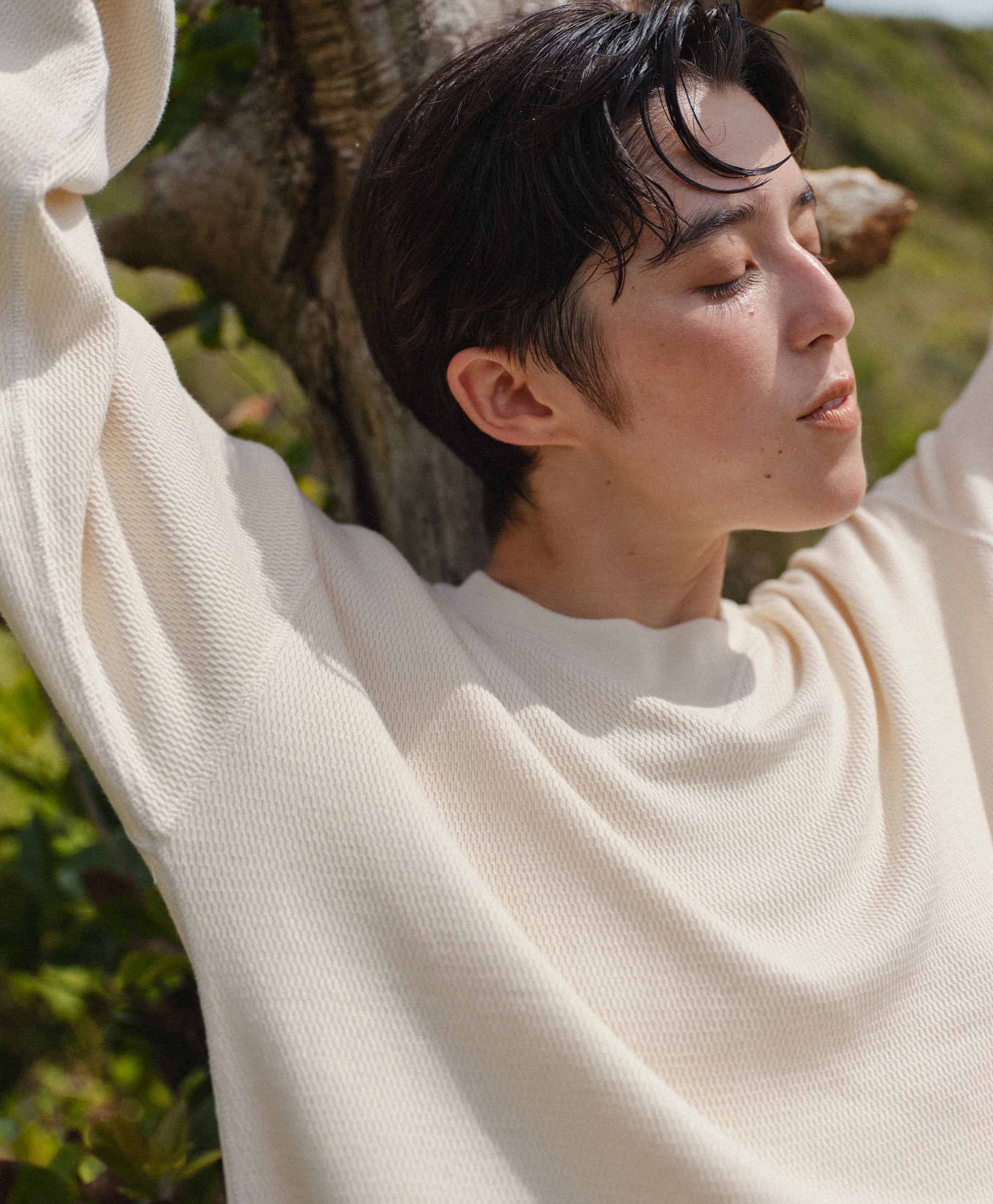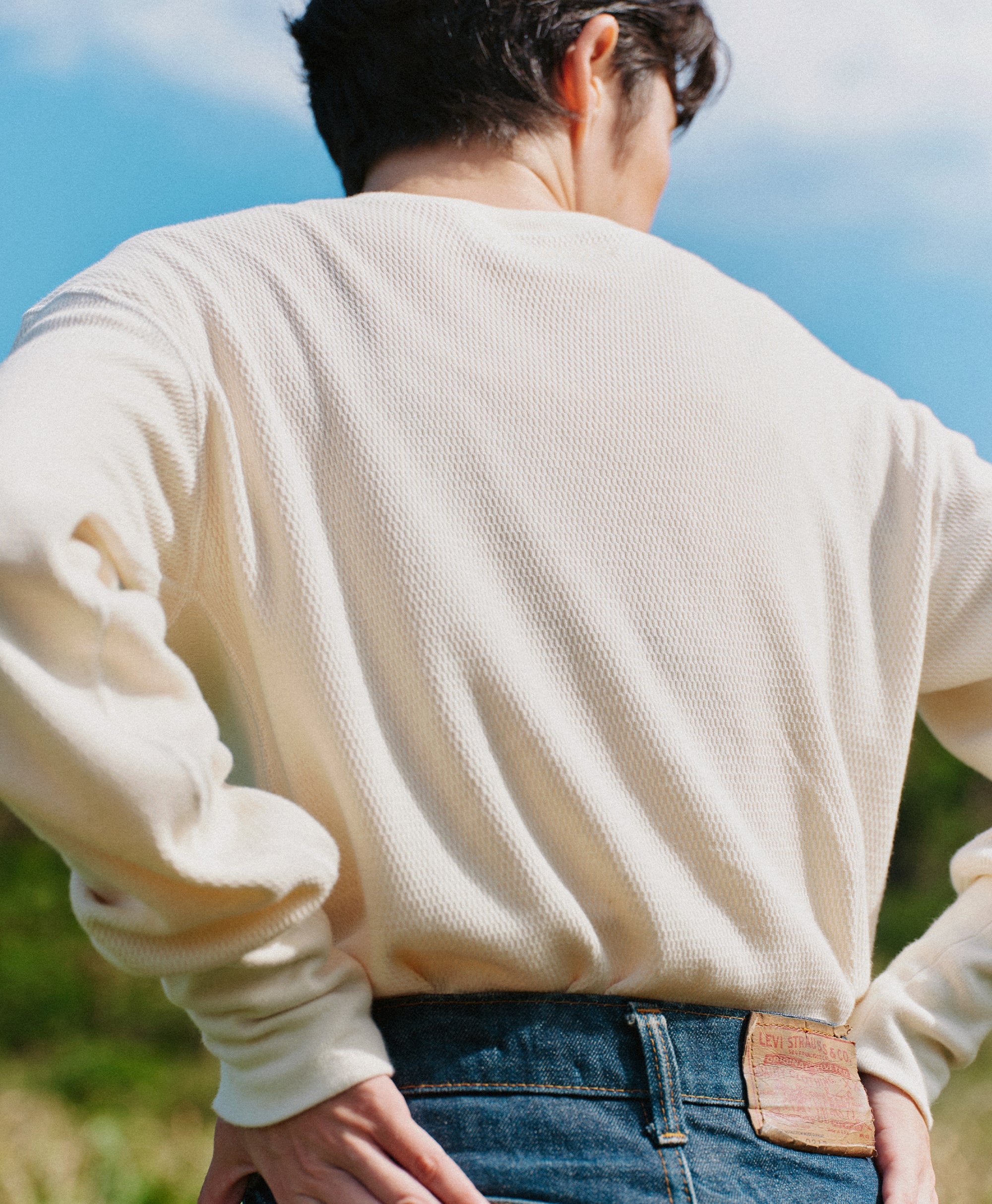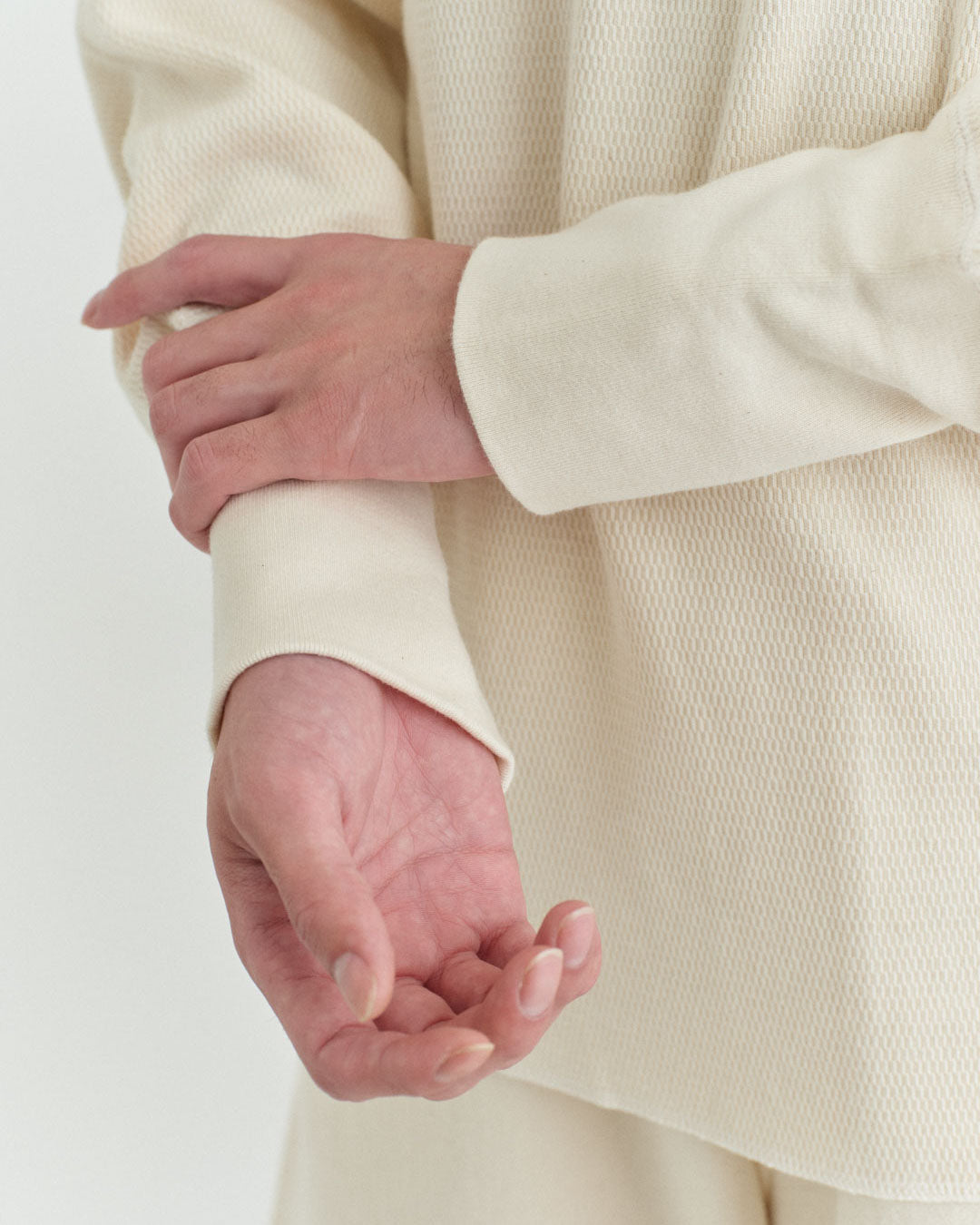 天然素材であるコットンは機能性が高く、 吸水性に優れ水に強く、耐久性が高いという特徴があります。ハニカム構造を採用しプレーンな見た目でスッキリと見せつつ、しっかりと空気を含むサーマルとしての機能性を残しています。20番手コットン1本を使用した繊細な素材は、サーマルに適した素材で、肌が当たる面積が少なくなることで着心地が良く、空気をよく含むため、肌と服との環境を最適に保ってくれます。強度が高く、毎日の洗濯でも生地が傷みにくいため長く着用が可能。化学繊維に比べると静電気が起こりにくいため、乾燥しがちな時期・乾燥地がちな肌にも身に着けやすい1着です。