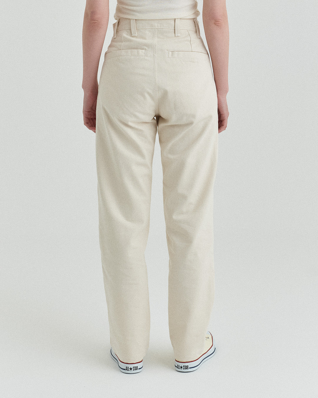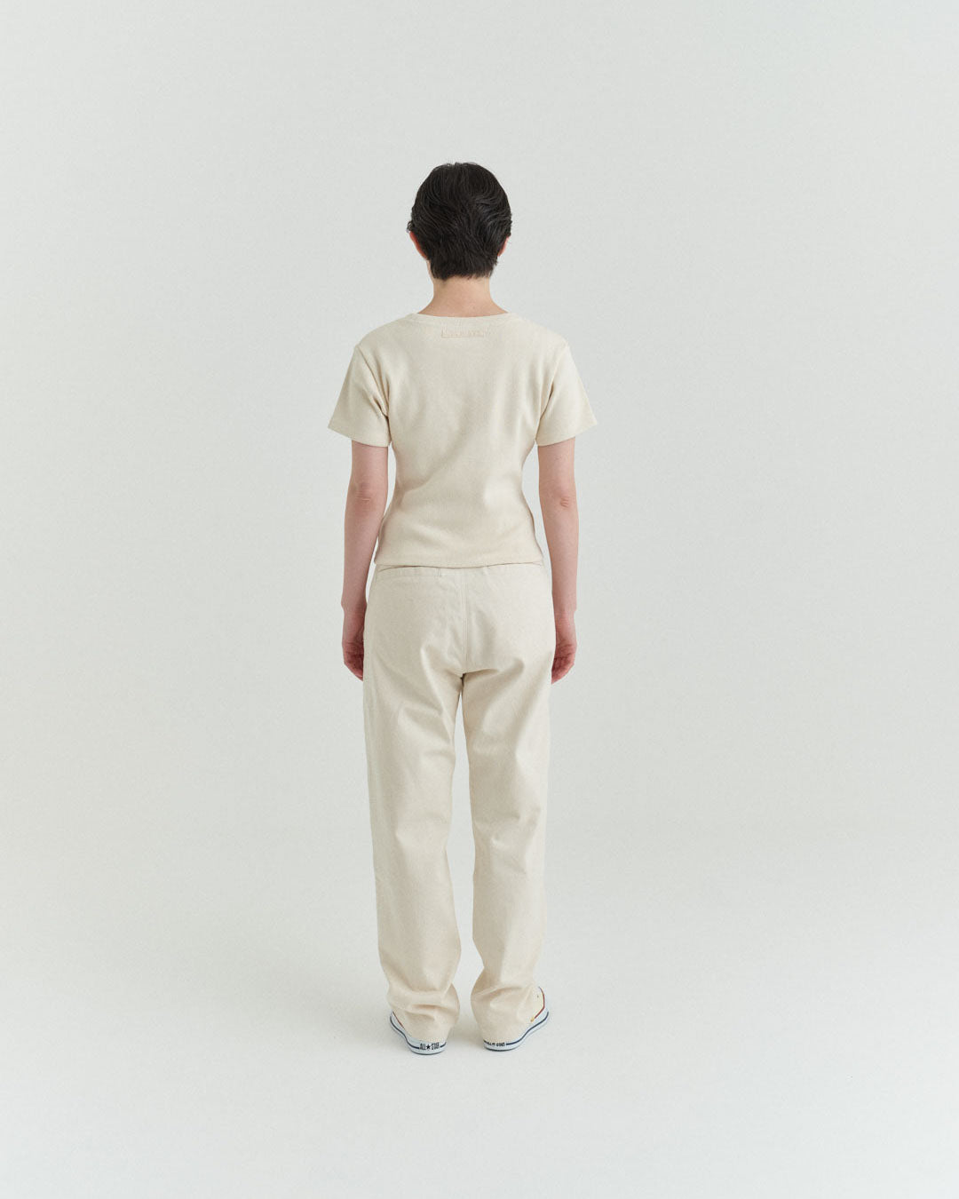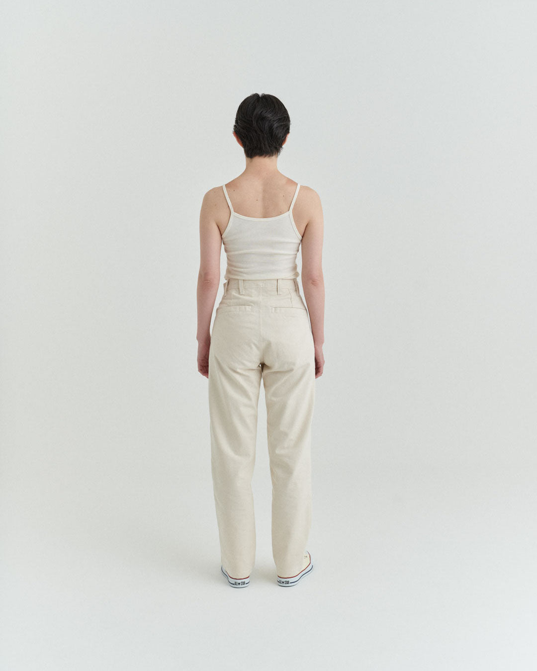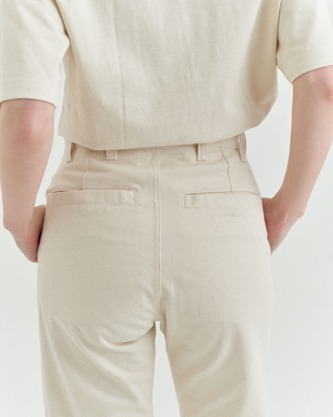 後ポケットはパッチポケットではなく片玉縁ポケットにして、すっきりとしたヒップ周り。