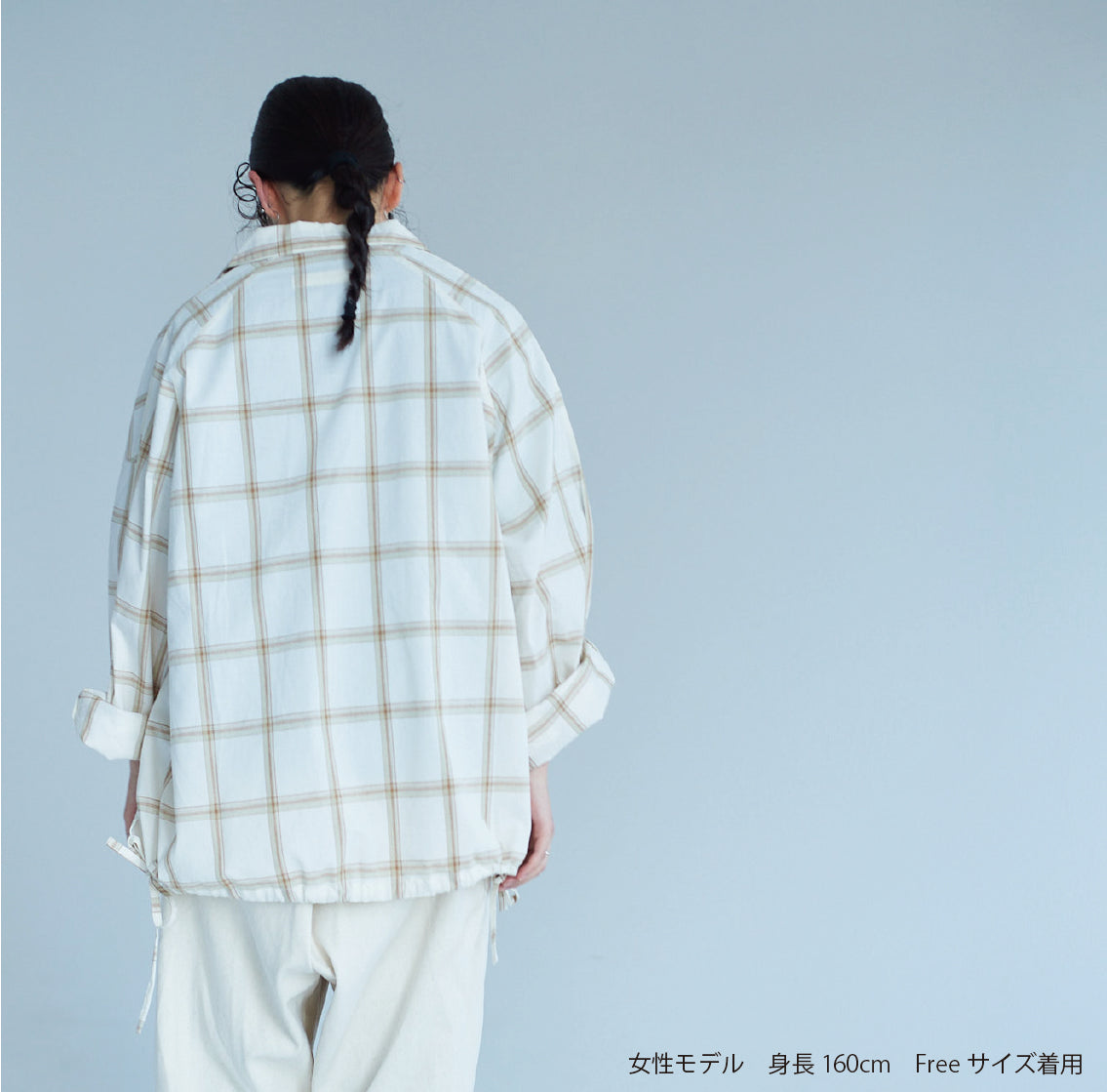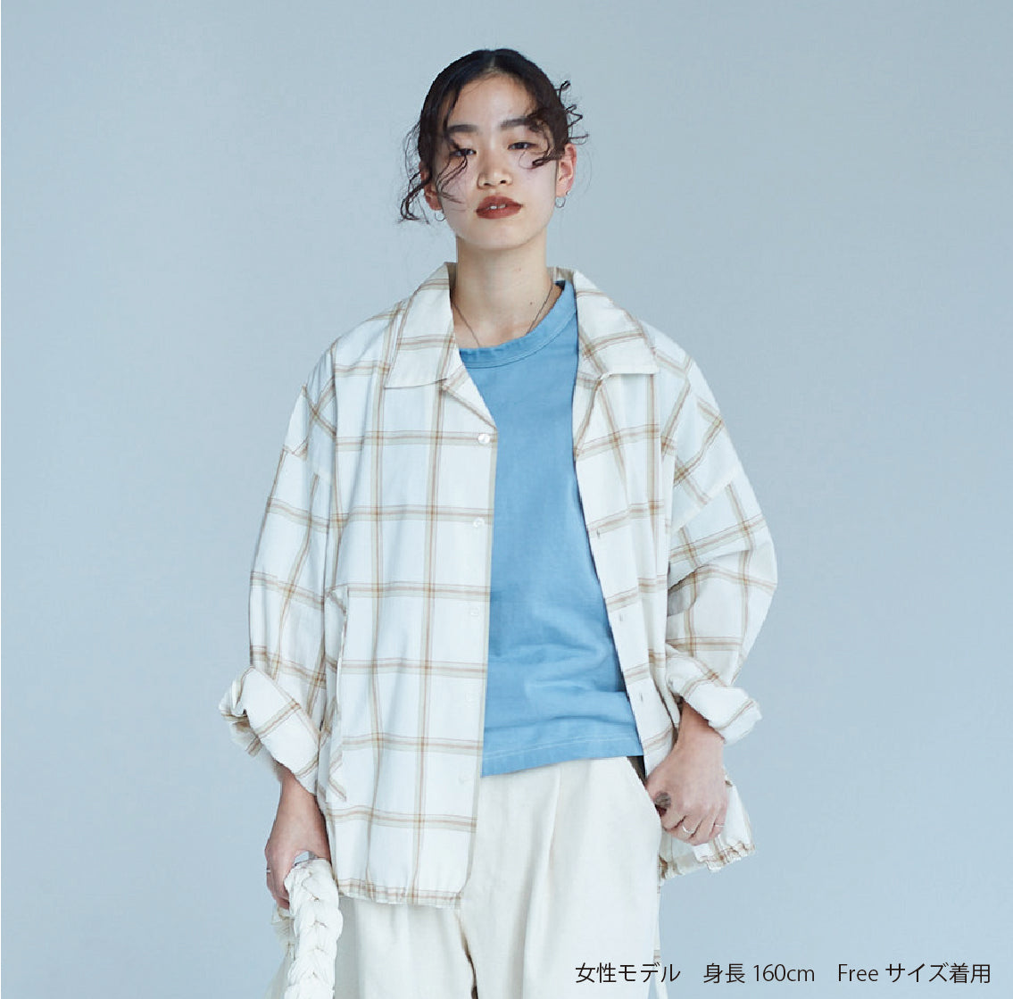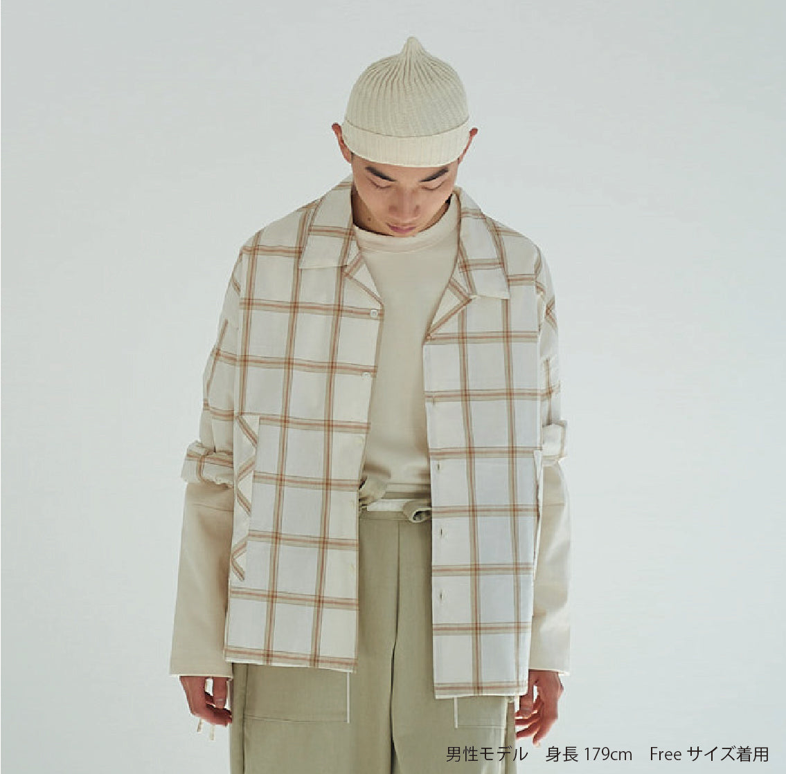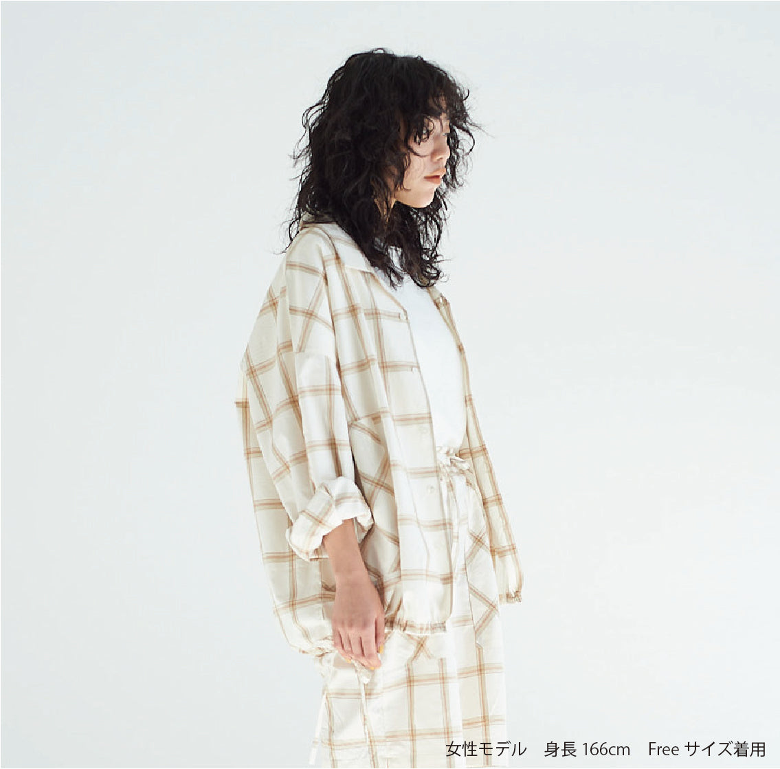 オープンカラーシャツとして一番上のボタンを外して着ても、抜け感がありサラッと一枚羽織ってもキマるアイテム。着用した時にはシンプルなシルエットラインに見えるがしっかりとした身幅サイズがありゆったりとリラックスして着用できる。FREEサイズとして男女ともに着れるように裾に紐が通っており、サイドで絞るとバルーンのシルエットを作り出すことができ、シルエットを変化して楽しめる。また、チェック柄を生かし立体感ある見た目になるように前ポケット部分はチェック生地をバイアス使用している。さらにSyncs.Earthで定番のTシャツなどにも採用している袖付け方法、後ろラグランスリーブを採用し、可動性と後ろのラインの美しさを出した。
