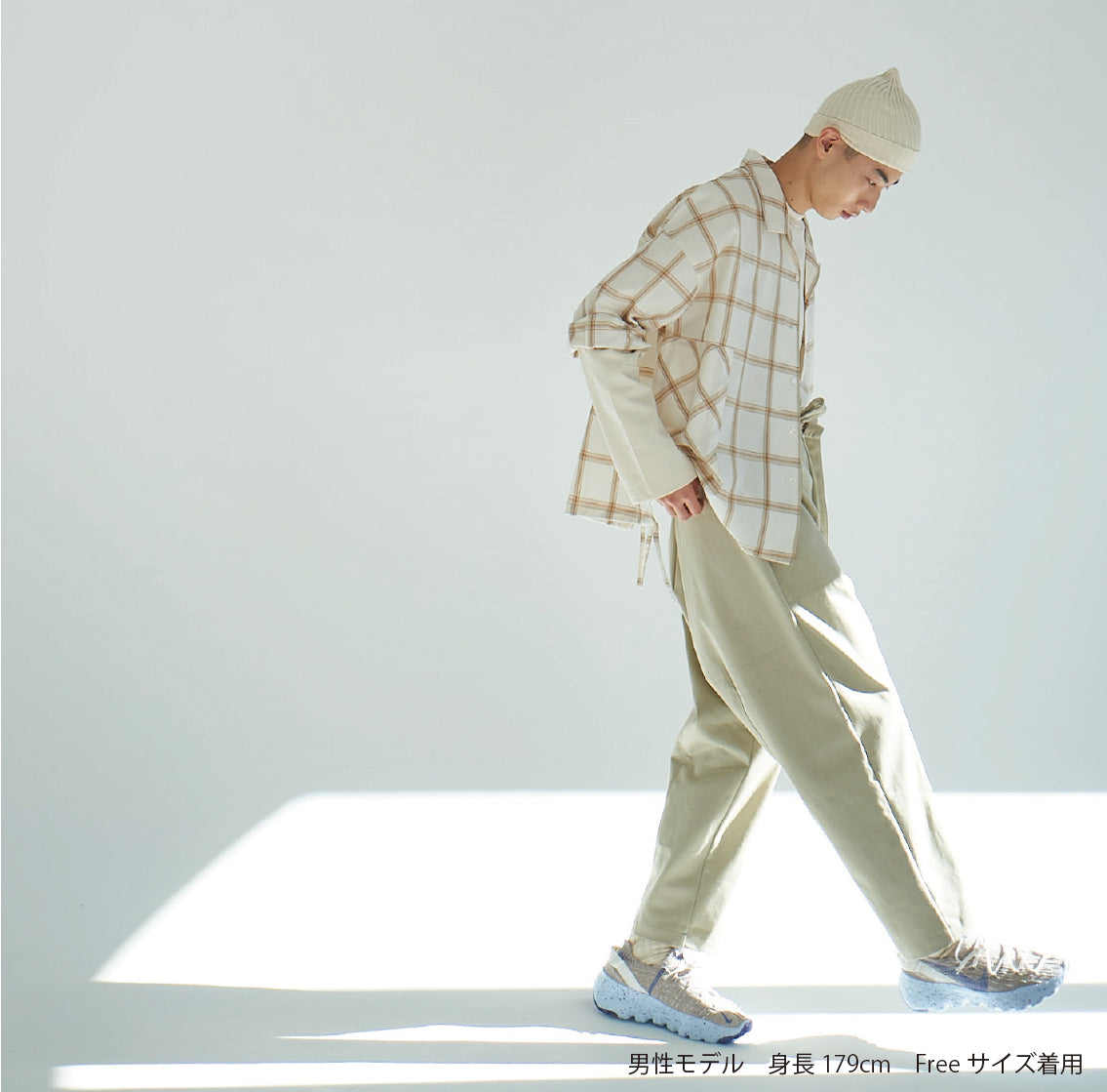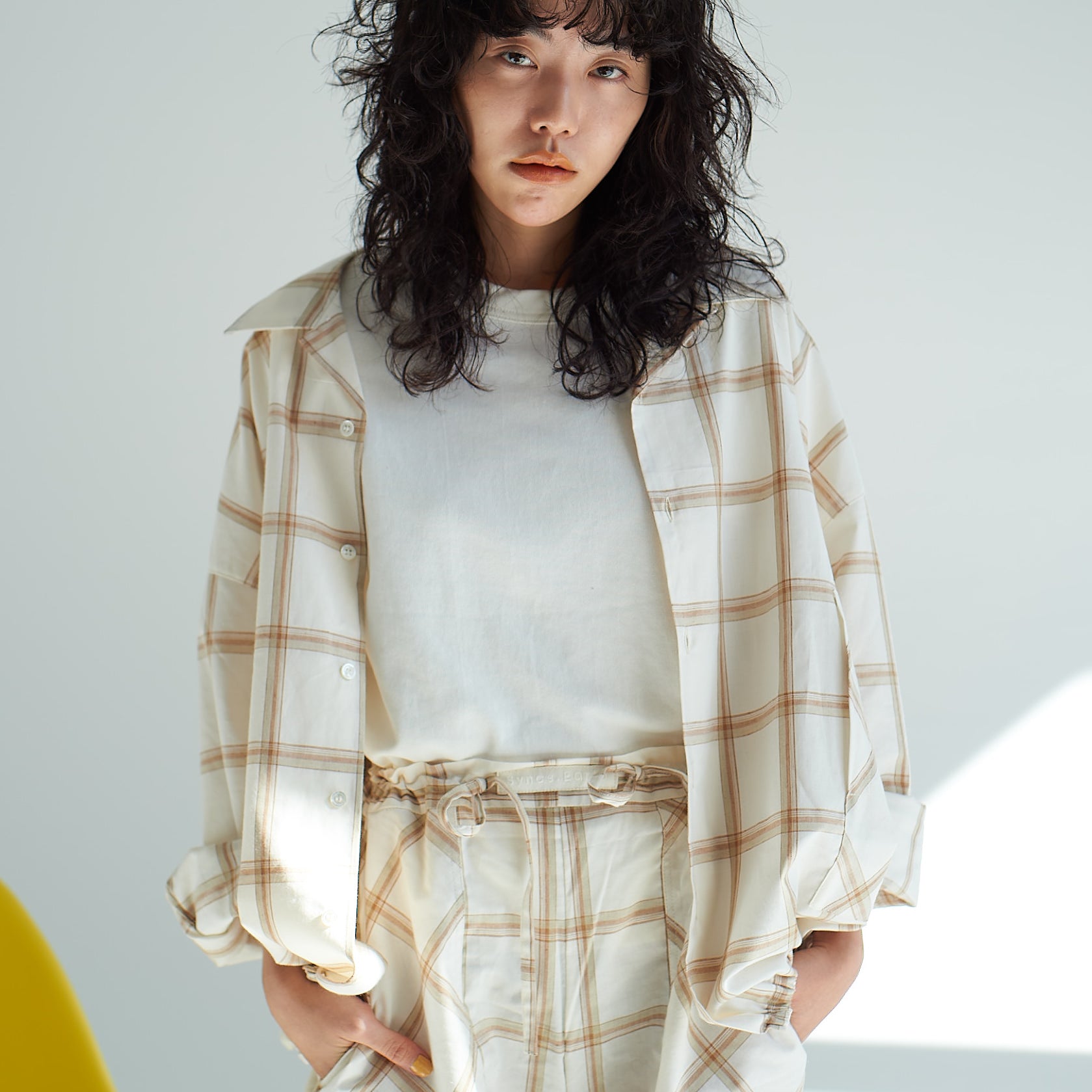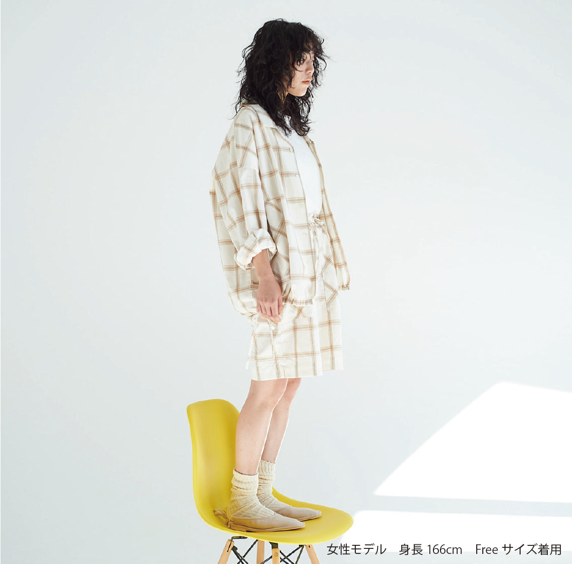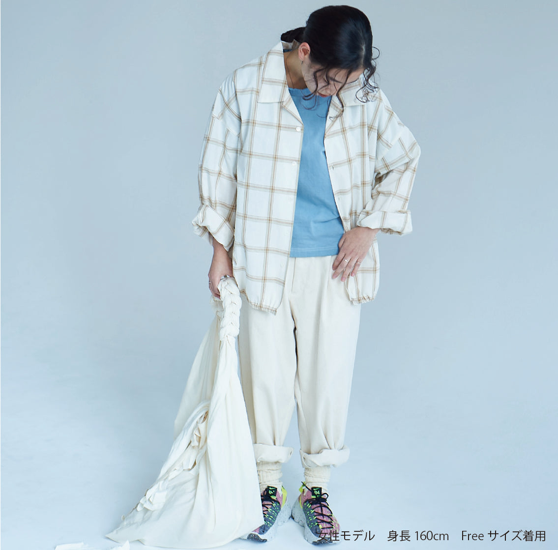オープンカラーシャツとして一番上のボタンを外して着ても、抜け感がありサラッと一枚羽織ってもキマるアイテム。着用した時にはシンプルなシルエットラインに見えるがしっかりとした身幅サイズがありゆったりとリラックスして着用できる。FREEサイズとして男女ともに着れるように裾に紐が通っており、サイドで絞るとバルーンのシルエットを作り出すことができ、シルエットを変化して楽しめる。また、チェック柄を生かし立体感ある見た目になるように前ポケット部分はチェック生地をバイアス使用している。さらにSyncs.Earthで定番のTシャツなどにも採用している袖付け方法、後ろラグランスリーブを採用し、可動性と後ろのラインの美しさを出した。
