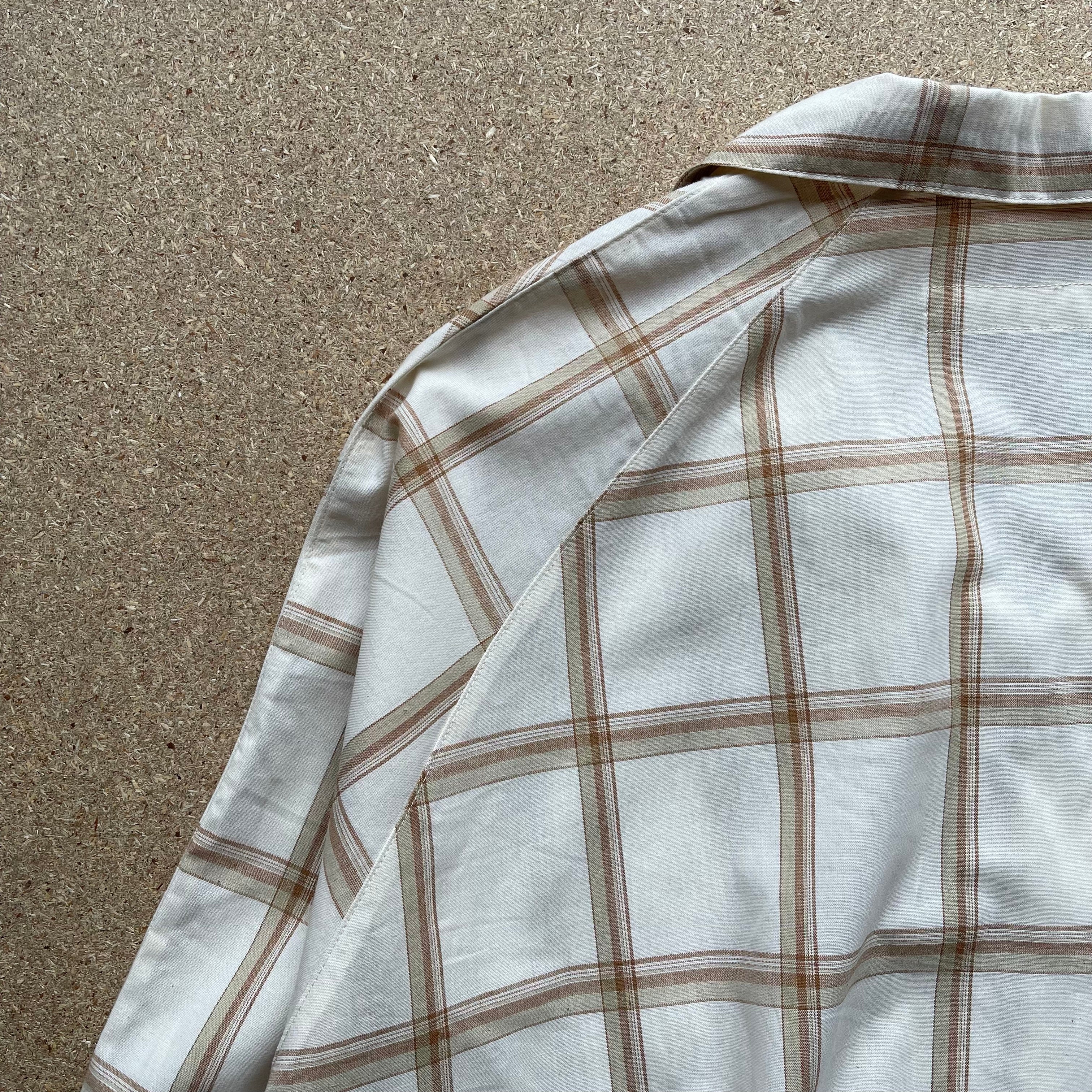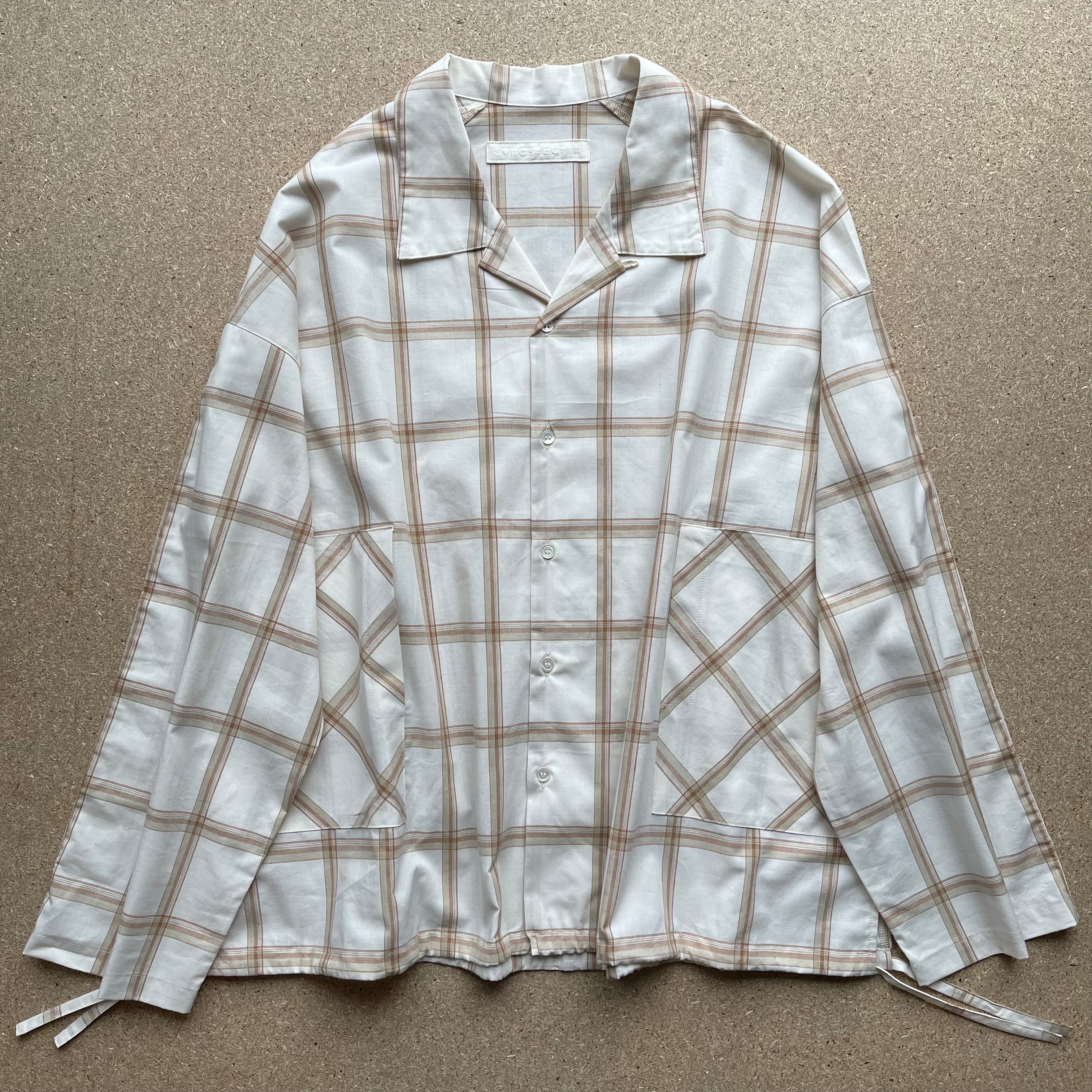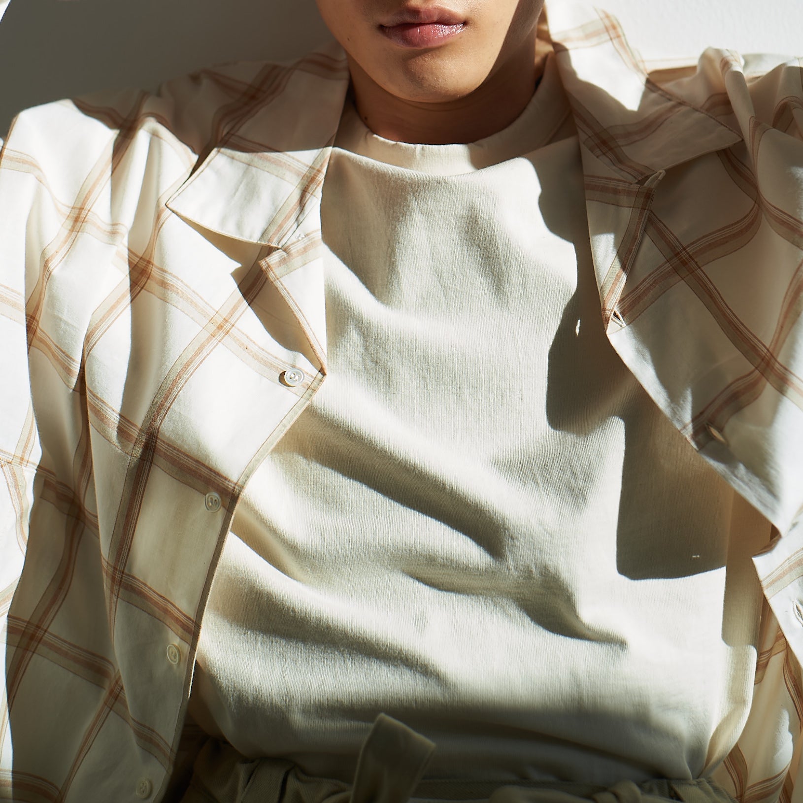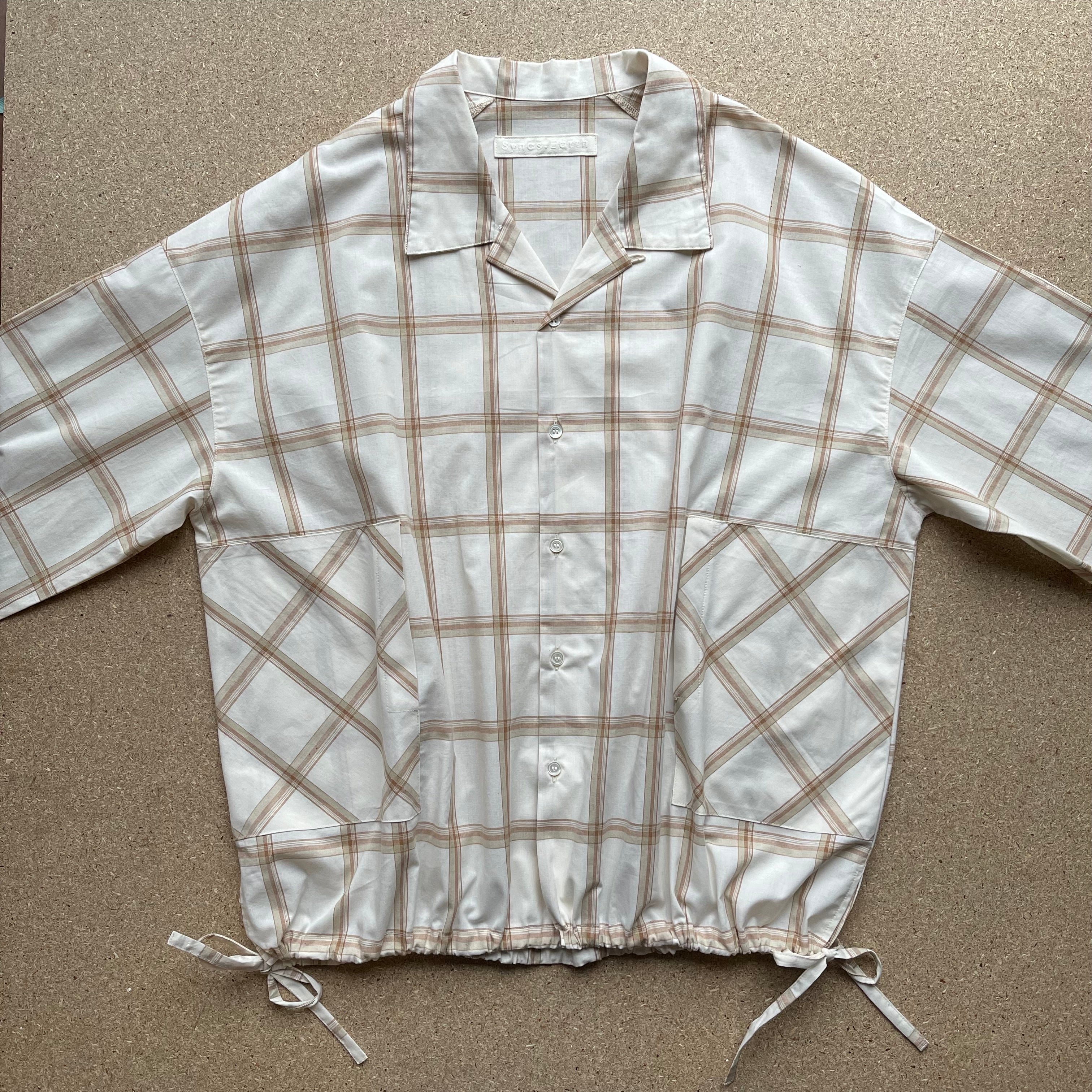 オープンカラーシャツとして一番上のボタンを外して着ても、抜け感がありサラッと一枚羽織ってもキマるアイテム。着用した時にはシンプルなシルエットラインに見えるがしっかりとした身幅サイズがありゆったりとリラックスして着用できる。FREEサイズとして男女ともに着れるように裾に紐が通っており、サイドで絞るとバルーンのシルエットを作り出すことができ、シルエットを変化して楽しめる。また、チェック柄を生かし立体感ある見た目になるように前ポケット部分はチェック生地をバイアス使用している。さらにSyncs.Earthで定番のTシャツなどにも採用している袖付け方法、後ろラグランスリーブを採用し、可動性と後ろのラインの美しさを出した。