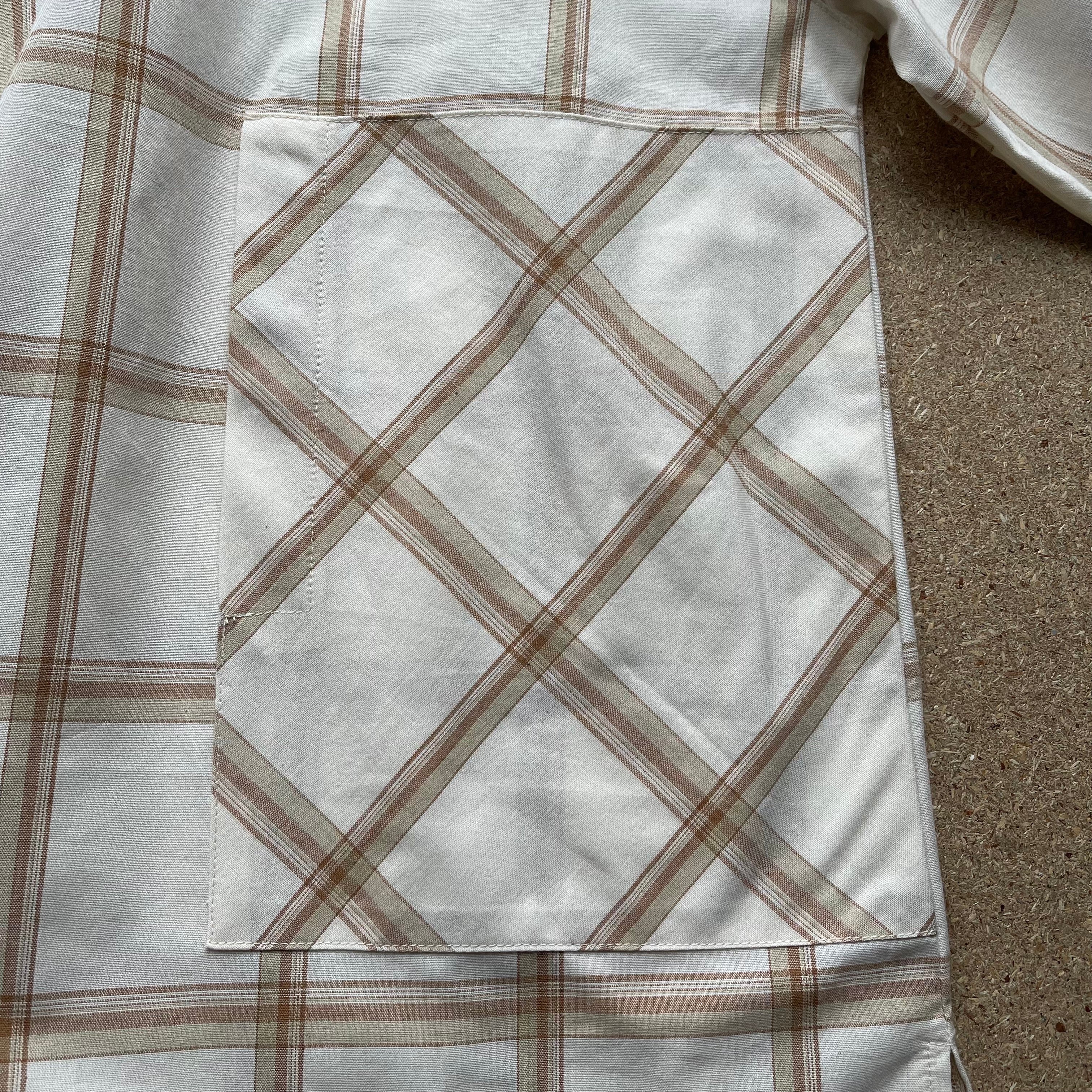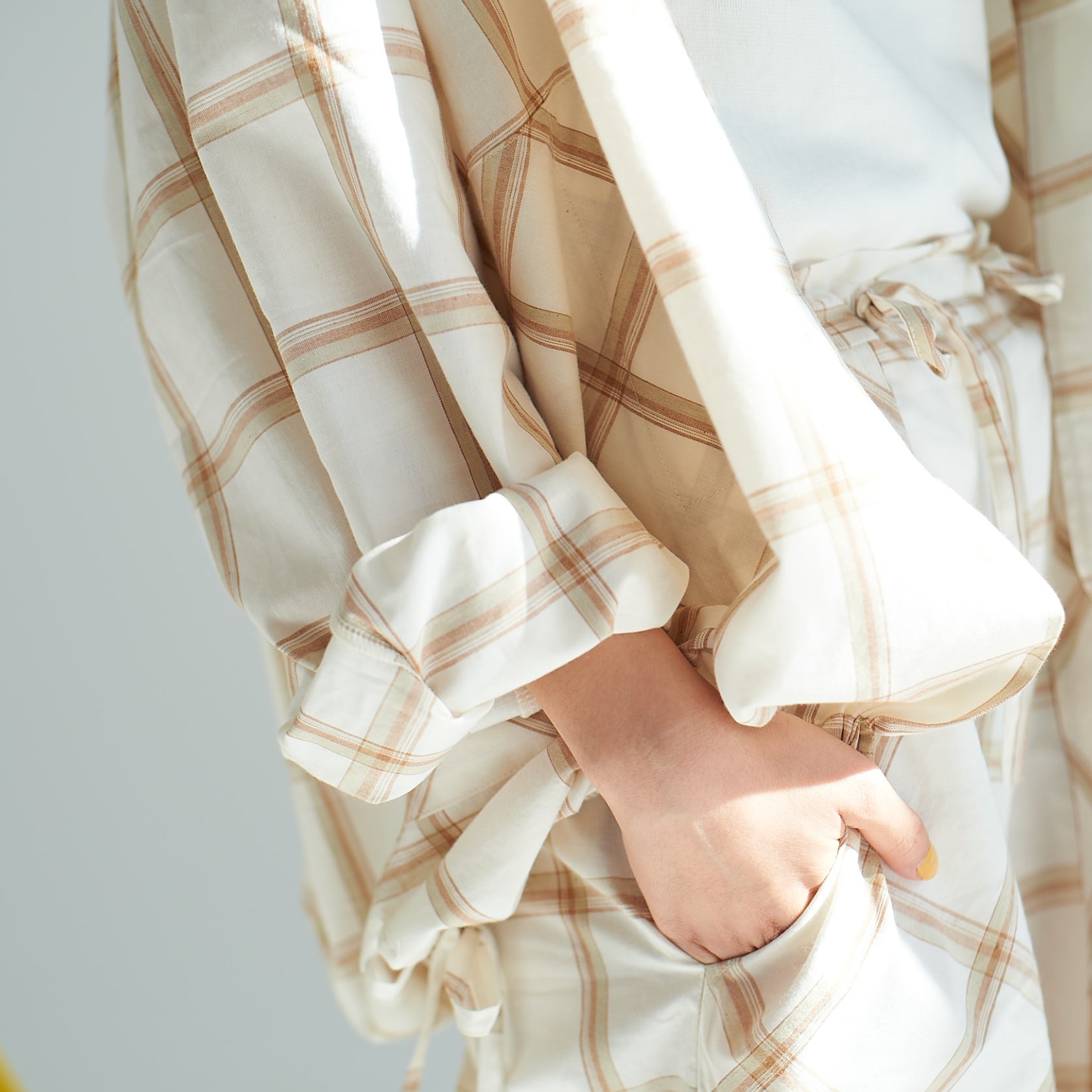 100%オーガニックコットン平織生地で、織りの密度があり表面のの高級感がある。また柔らかさもあり、シルエットバランスと相まってとても心地の良い肌触りの1着。チェック柄の色はオーガニックコットンの本来の色である茶綿、緑綿を使用し、一切染色もしていないSyncs.Earthの土に還し、土壌に影響のないもの作り基準を満たしている。