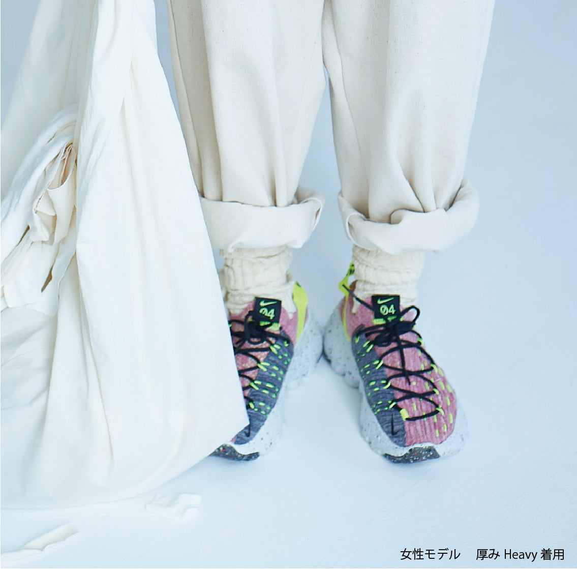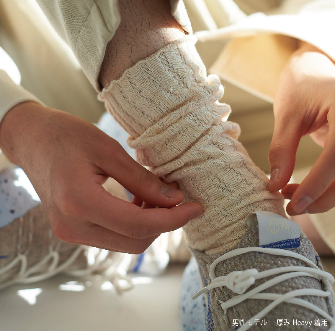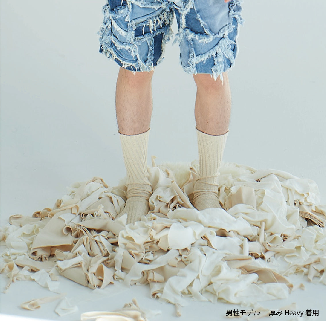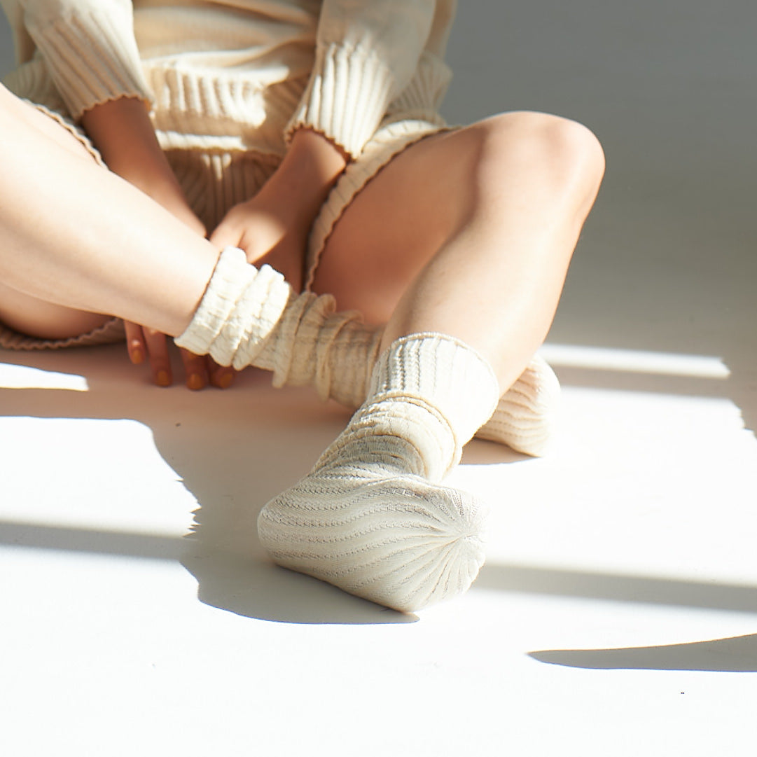 Syncs.Earthが提案する新しいルーズソックススタイル。ストレートタイプで様々な足のサイズに対応するオーガニックコットン100%の心地良いソックス。