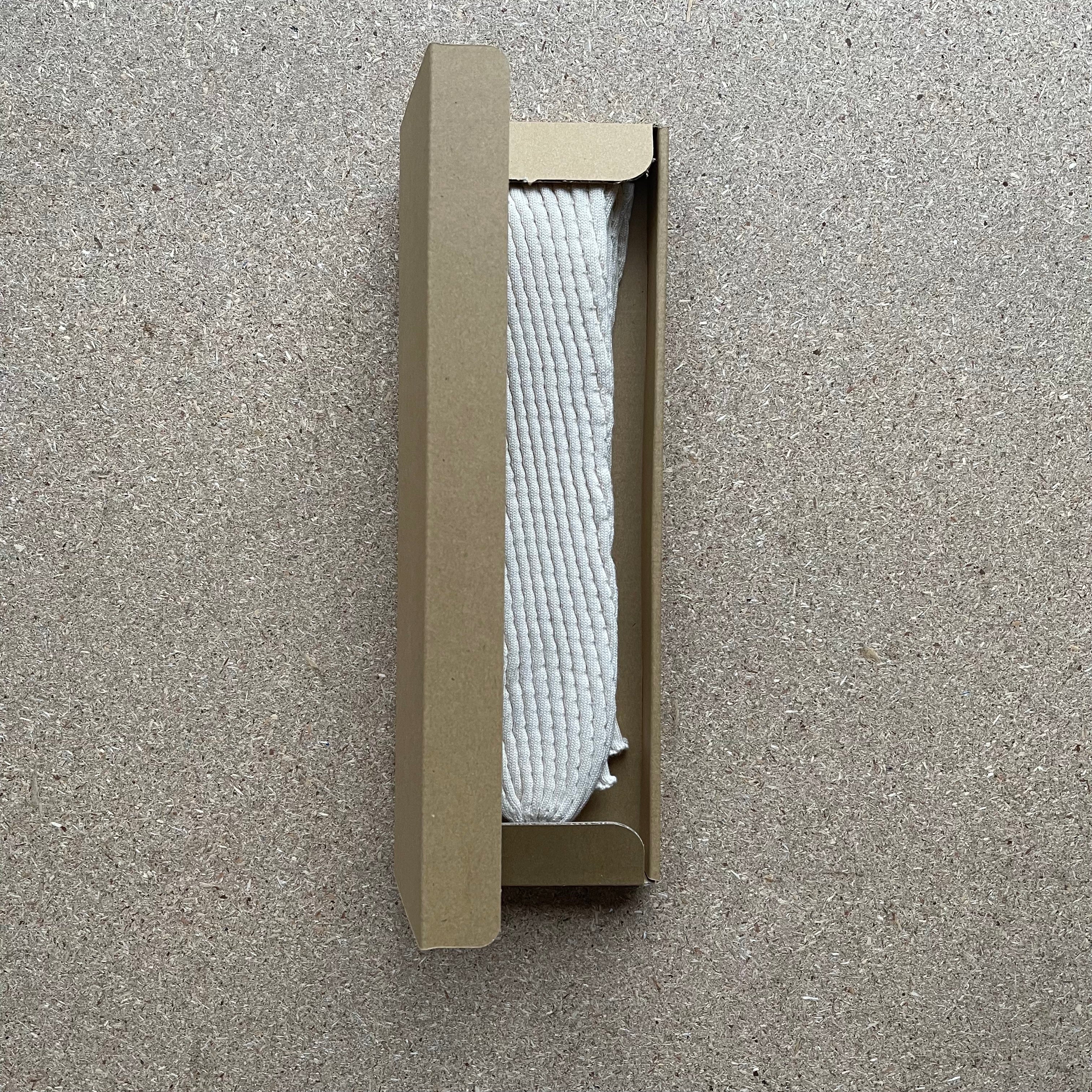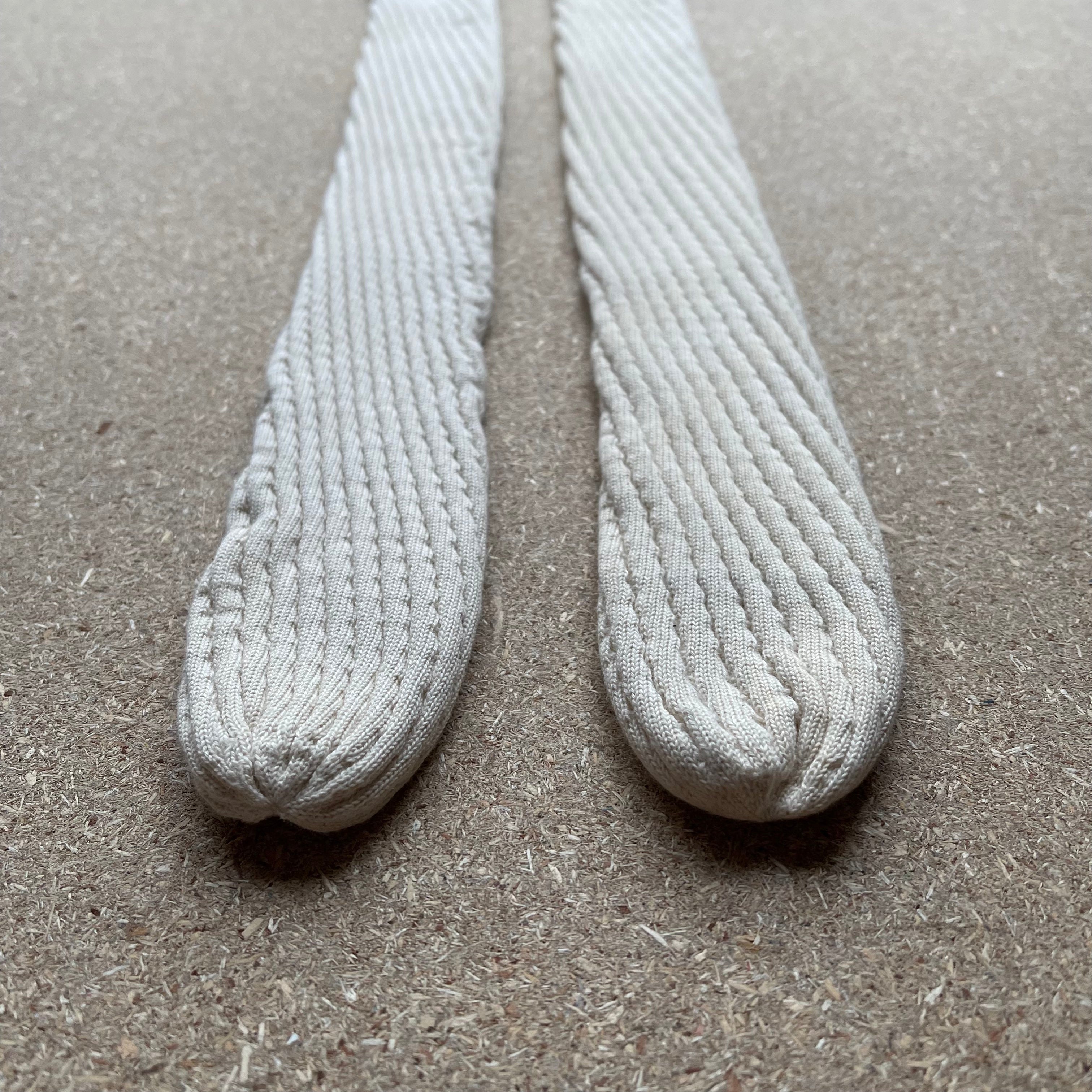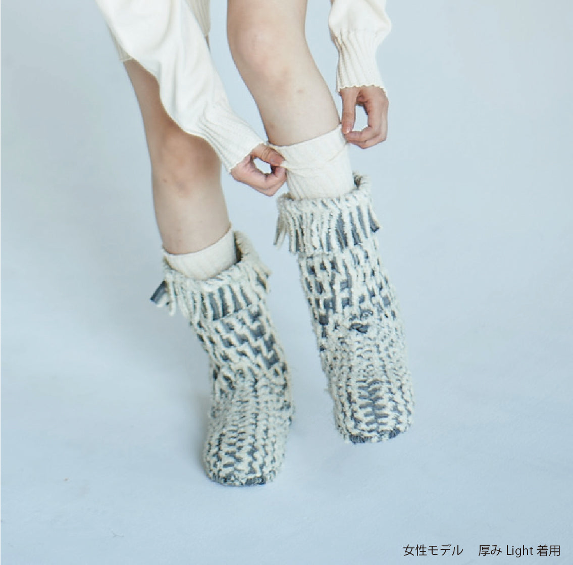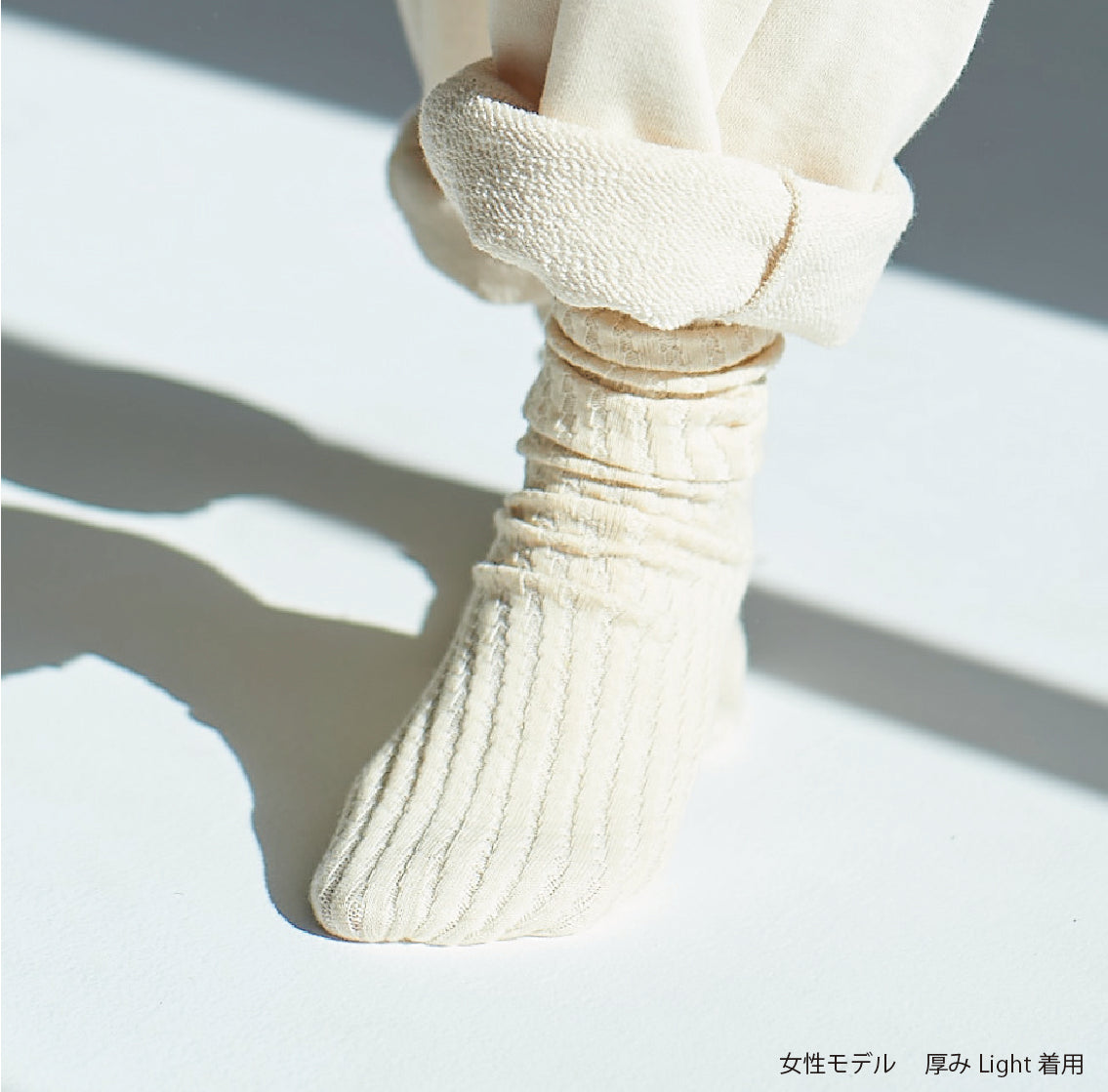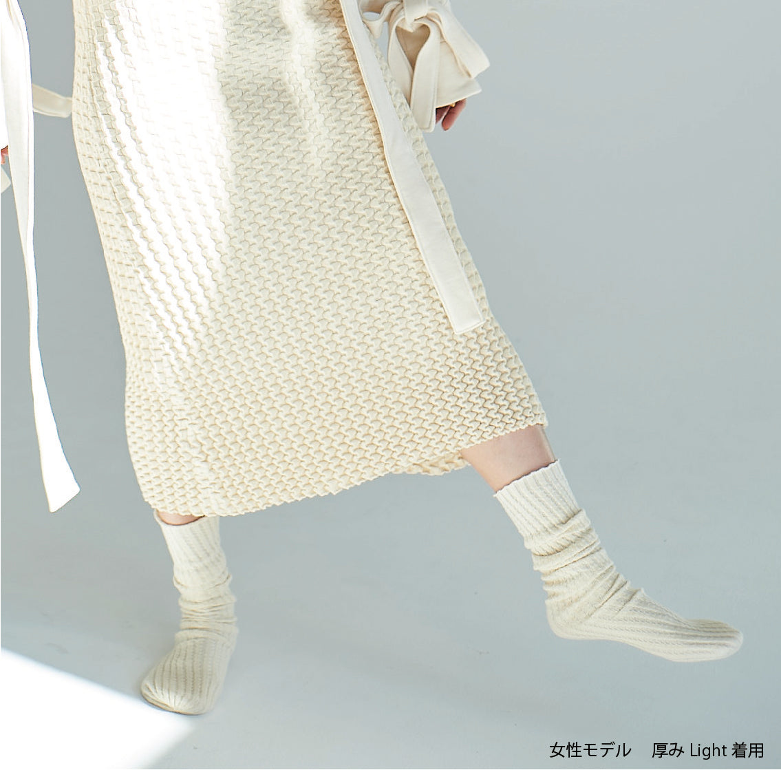オーガニックコットン100%の無染色糸を使用し縫い目のない3Dニットであるホールガーメントを使用し無駄がなく作られたソックス。厚さの違う2種類を用意。しっかりと厚みがありタフな使用にも耐えられるHeavyタイプと、絶妙な薄さで履き心地を追求したLigthタイプ。*どちらも一度履くとカカト部分は少し伸びますが洗濯で戻ります。あたなの足に合わせた1足となります。